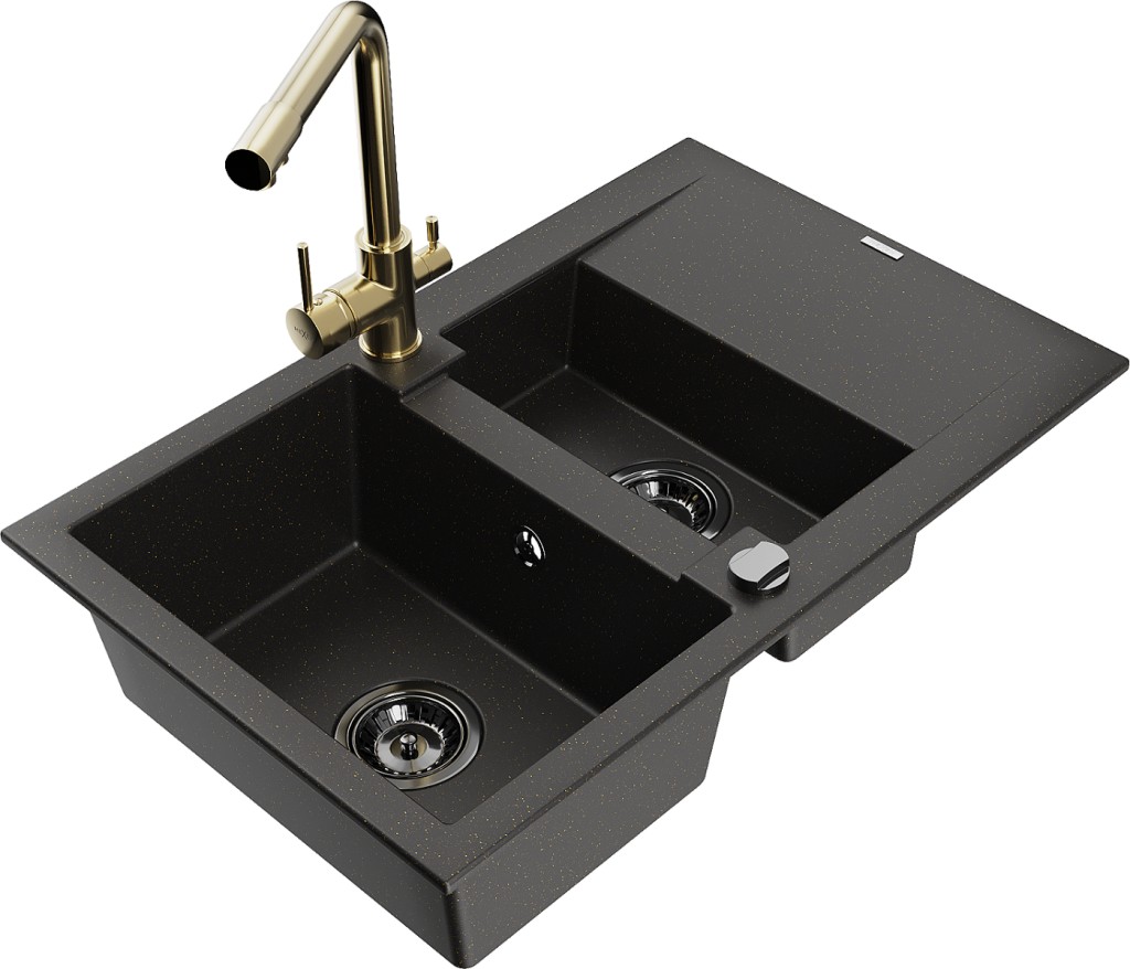 Technické dáta: drez: Rozmer: 737x475x177mm Hĺbka komory: 167 mm (väčšia), 107 mm (menšia) Rozmery komory: 395x272 mm (väčšie), (menšie) 375x182 mm Priemer odtoku: ø90 mm Typ: 1,5-komorový s krátkym odkvapkávačom Typ: Zapustené do pracovnej dosky Farba: čierna / zlatá metalíza Povrchová úprava sifónu: čierna Materiál: žula (80% žulové kamenivo, 20% živice) Prepadový otvor: Áno Otvory: (batérie, automatické) 2 Inštalácia: Univerzálna, je možné inštalovať s odkvapkávačom na ľavú alebo pravú stranu Vysoká odolnosť proti poškriabaniu a zmene farby Odolnosť proti tepelným šokom Ľahko čistiteľný povrch kuchynská batéria: Materiál: mosadz Farba: Zlatá Hlava: Keramická Prevzdušňovač: Áno Typ: Dve rukoväte Rozsah výtoku: 235 mm Výška batérie: 315 mm Dvojhlavá batéria s prídavným kanálom pre filtrovanú pitnú vodu(GT) Ean: 5905315024121