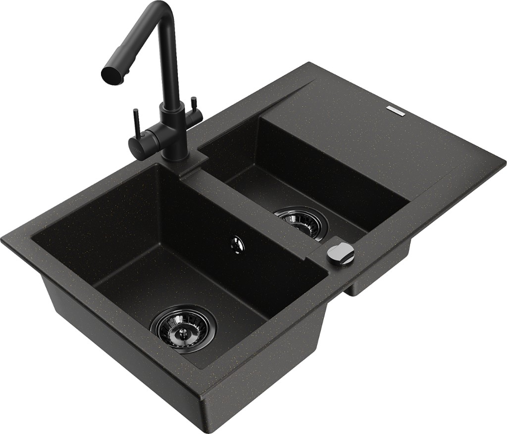 Technické dáta: drez: Rozmer: 737x475x177mm Hĺbka komory: 167 mm (väčšia), 107 mm (menšia) Rozmery komory: 395x272 mm (väčšie), (menšie) 375x182 mm Priemer odtoku: ø90 mm Typ: 1,5-komorový s krátkym odkvapkávačom Typ: Zapustené do pracovnej dosky Farba: čierna / zlatá metalíza Povrchová úprava sifónu: čierna Materiál: žula (80% žulové kamenivo, 20% živice) Prepadový otvor: Áno Otvory: (batérie, automatické) 2 Inštalácia: Univerzálna, je možné inštalovať s odkvapkávačom na ľavú alebo pravú stranu Vysoká odolnosť proti poškriabaniu a zmene farby Odolnosť proti tepelným šokom Ľahko čistiteľný povrch kuchynská batéria: Materiál: mosadz Čierna farba Hlava: Keramická Prevzdušňovač: Áno Typ: Dve rukoväte Rozsah výtoku: 235 mm Výška batérie: 315 mm Dvojhlavá batéria s prídavným kanálom pre filtrovanú pitnú vodu(GT) Ean: 5905315024145