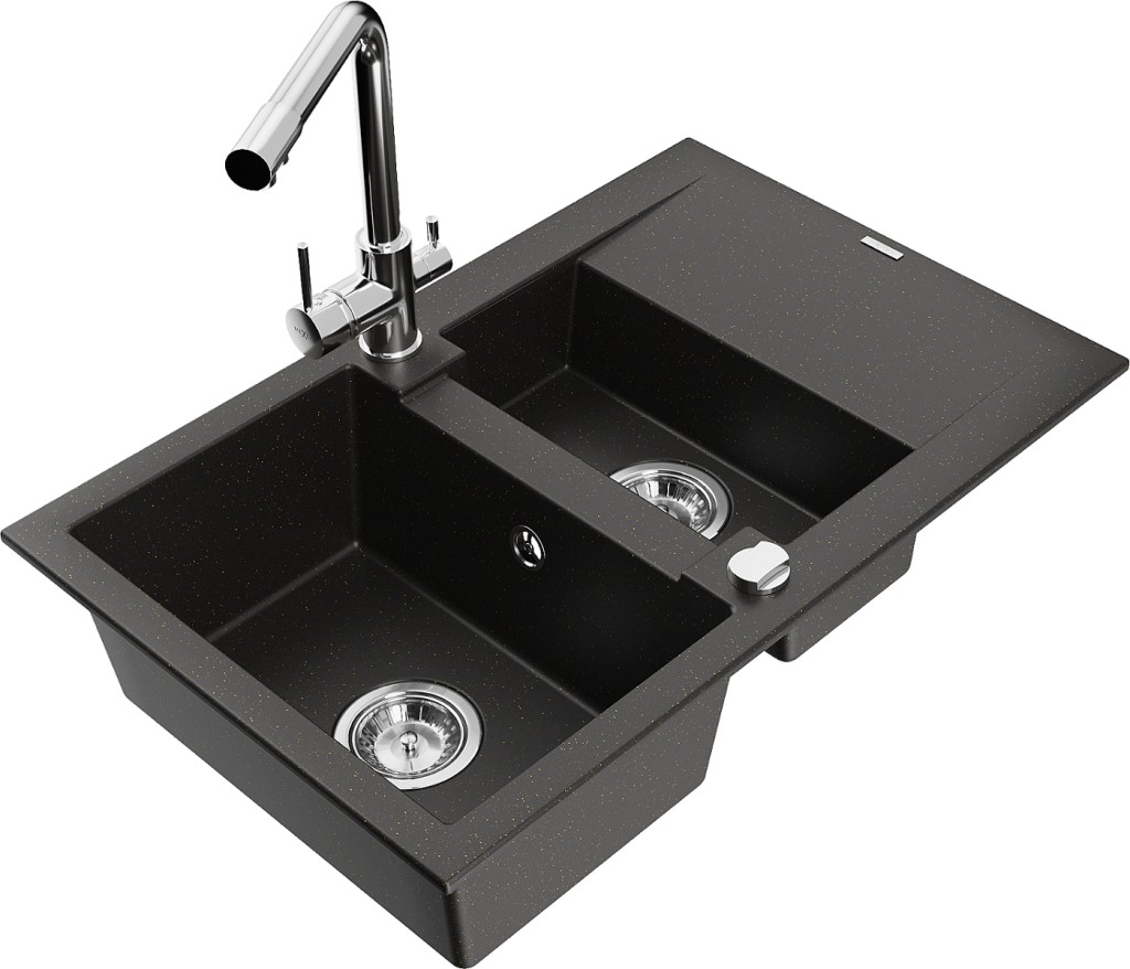Technické dáta: drez: Rozmer: 737x475x177mm Hĺbka komory: 167 mm (väčšia), 107 mm (menšia) Rozmery komory: 395x272 mm (väčšie), (menšie) 375x182 mm Priemer odtoku: ø90 mm Typ: 1,5-komorový s krátkym odkvapkávačom Typ: Zapustené do pracovnej dosky Farba: čierna / zlatá metalíza Povrchová úprava sifónu: Chrome Materiál: žula (80% žulové kamenivo, 20% živice) Prepadový otvor: Áno Otvory: (batérie, automatické) 2 Inštalácia: Univerzálna, je možné inštalovať s odkvapkávačom na ľavú alebo pravú stranu Vysoká odolnosť proti poškriabaniu a zmene farby Odolnosť proti tepelným šokom Ľahko čistiteľný povrch kuchynská batéria: Materiál: mosadz Farba: Chrome Hlava: Keramická Prevzdušňovač: Áno Typ: Dve rukoväte Rozsah výtoku: 235 mm Výška batérie: 315 mm Dvojhlavá batéria s prídavným kanálom pre filtrovanú pitnú vodu(GT) Ean: 5905315024107