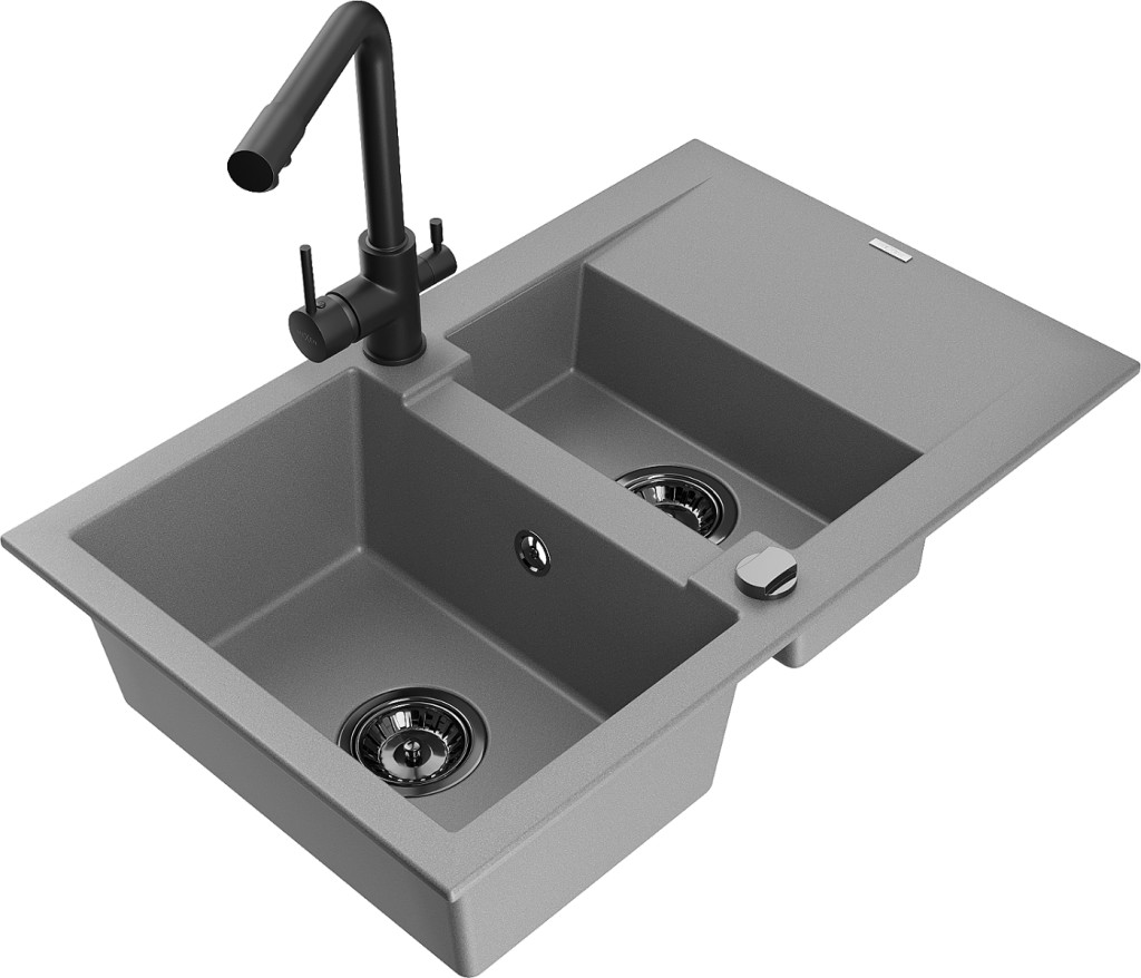 Technické dáta: Drez: Rozmer: 737x475x177 mm Hĺbka komory: 167 mm (väčšia), 107 mm (menšia) Rozmery komory: 395x272 mm (väčšie), (menšie) 375x182 mm Priemer odtoku: ø90 mm Typ: 1,5-miska s krátkym odkvapkávačom Typ: Zapustené do pracovnej dosky Šedá farba Povrchová úprava sifónu: čierna Materiál: žula (80% žulové kamenivo 20% živice) Prepadový otvor: Áno Otvory: (batérie, automat) 2 Inštalácia: Univerzálna, je možné inštalovať s odkvapkávačom na ľavú alebo pravú stranu Vysoká odolnosť proti poškriabaniu a zmene farby Odolnosť proti tepelným šokom Povrch pre ľahké čistenie Kuchynská batéria: Materiál: mosadz Čierna farba Hlava: Keramická Perlátor: Áno Typ: Dve rukoväte Rozsah výtoku: 235 mm Výška batérie: 315 mm Dvojhlavá batéria s prídavným filtrom na pitnú vodu(GT) Ean: 5905315024046