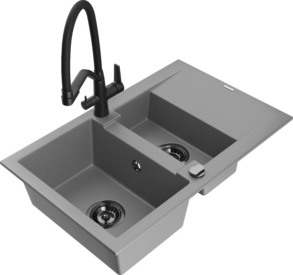 Technické dáta: Drez: Rozmer: 737x475x177 mm Hĺbka komory: 167 mm (väčšia), 107 mm (menšia) Rozmery komory: 395x272 mm (väčšie), (menšie) 375x182 mm Priemer odtoku: ø90 mm Typ: 1,5-miska s krátkym odkvapkávačom Typ: Zapustené do pracovnej dosky Šedá farba Povrchová úprava sifónu: čierna Materiál: žula (80% žulové kamenivo 20% živice) Prepadový otvor: Áno Otvory: (batérie, automat) 2 Inštalácia: Univerzálna, je možné inštalovať s odkvapkávačom na ľavú alebo pravú stranu Vysoká odolnosť proti poškriabaniu a zmene farby Odolnosť proti tepelným šokom Povrch pre ľahké čistenie Kuchynská batéria: Materiál: mosadz Čierna farba Hlavy: Keramické Perlátor: Áno Typ výtoku: Flexibilný s mosadzným držiakom Rozsah výtoku: 260 mm Výška: 405 mm Typ: Dve rukoväte Dvojhlavá batéria s prídavným filtrom na pitnú vodu(GT) Ean: 5905315100597