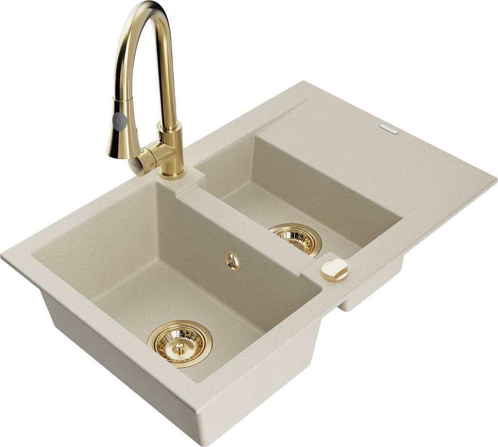 Technické dáta: Drez: Rozmer: 737x475x177 mm Hĺbka komory: 167 mm (väčšia), 107 mm (menšia) Rozmery komory: 395x272 mm (väčšie), (menšie) 375x182 mm Priemer odtoku: ø90 mm Typ: 1,5-miska s krátkym odkvapkávačom Typ: Zapustené do pracovnej dosky Farba béžová Povrchová úprava sifónu: zlatá Materiál: žula (80% žulové kamenivo 20% živice) Prepadový otvor: Áno Otvory: (batérie, automat) 2 Inštalácia: Univerzálna, je možné inštalovať s odkvapkávačom na ľavú alebo pravú stranu Vysoká odolnosť proti poškriabaniu a zmene farby Odolnosť proti tepelným šokom Povrch pre ľahké čistenie Kuchynská batéria: Materiál: mosadz Farba: Zlatá Hlava: Keramická Perlátor: Áno Typ: Jednopákové Výška batérie: 380 mm Rozsah výtoku: 252 mm Typ výtoku: Výsuvný(GT) Ean: 5905315029119