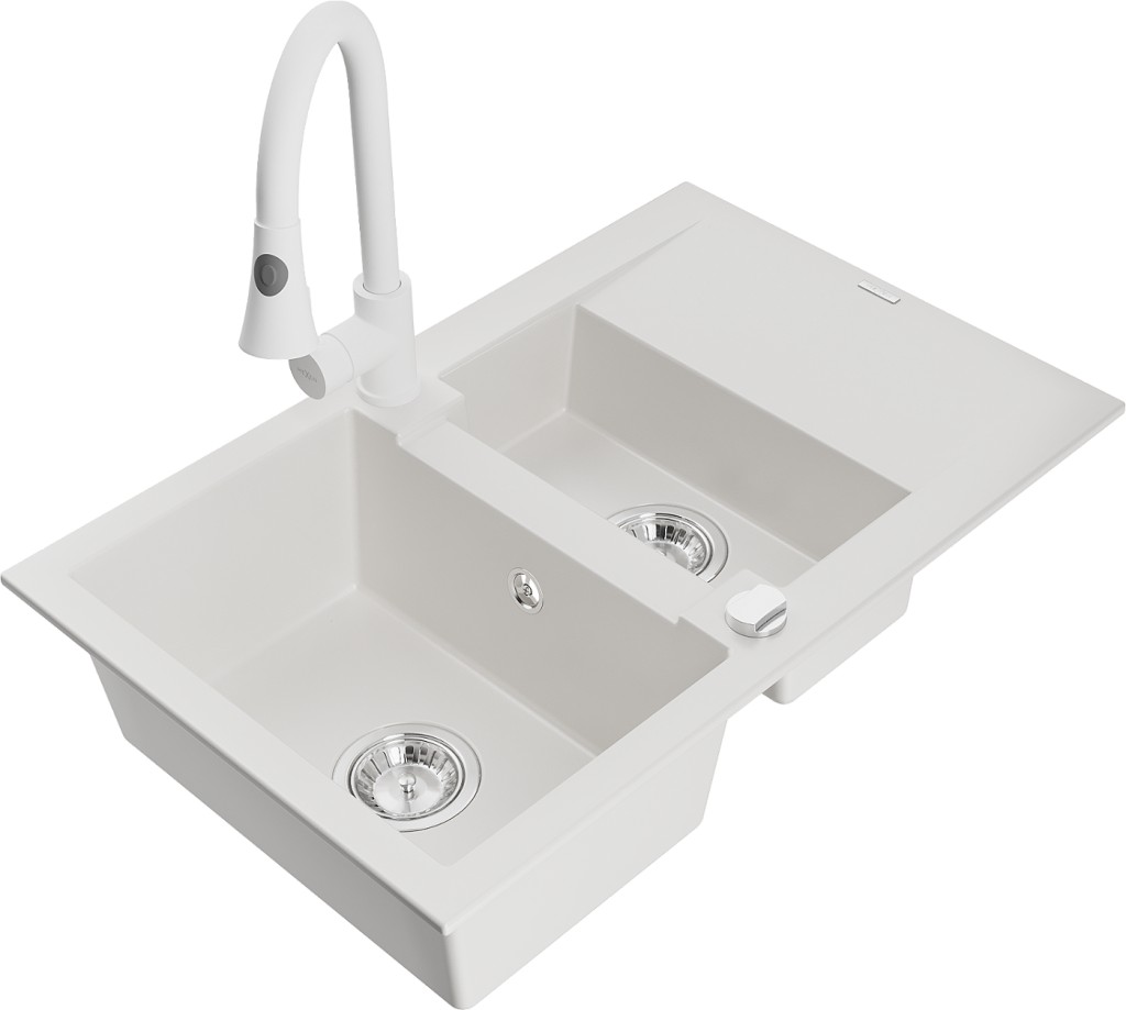 Technické dáta: drez: Rozmer: 737x475x177mm Hĺbka komory: 167 mm (väčšia), 107 mm (menšia) Rozmery komory: 395x272 mm (väčšie), (menšie) 375x182 mm Priemer odtoku: ø90 mm Typ: 1,5-miska s krátkym odkvapkávačom Typ: Zapustené do pracovnej dosky biela farba Povrchová úprava sifónu: Chrome Materiál: žula (80% žulové kamenivo, 20% živice) Prepadový otvor: Áno Otvory: (batérie, automatické) 2 Inštalácia: Univerzálna, je možné inštalovať s odkvapkávačom na ľavú alebo pravú stranu Vysoká odolnosť proti poškriabaniu a zmene farby Odolnosť proti tepelným šokom Ľahko čistiteľný povrch kuchynská batéria: Materiál: mosadz biela farba Hlava: Keramická Prevzdušňovač: Áno Typ: Jedna páka Výška batérie: 380 mm Rozsah výtoku: 252 mm Typ výtoku: Výsuvný(GT) Ean: 5905315029065