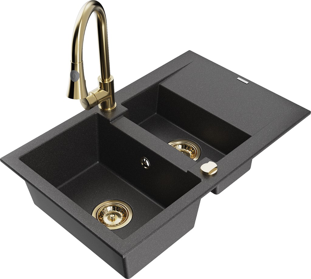 Technické dáta: drez: Rozmer: 737x475x177mm Hĺbka komory: 167 mm (väčšia), 107 mm (menšia) Rozmery komory: 395x272 mm (väčšie), (menšie) 375x182 mm Priemer odtoku: ø90 mm Typ: 1,5-miska s krátkym odkvapkávačom Typ: Zapustené do pracovnej dosky Farba: Škvrnitá čierna Povrchová úprava sifónu: zlatá Materiál: žula (80% žulové kamenivo, 20% živice) Prepadový otvor: Áno Otvory: (batérie, automatické) 2 Inštalácia: Univerzálna, je možné inštalovať s odkvapkávačom na ľavú alebo pravú stranu Vysoká odolnosť proti poškriabaniu a zmene farby Odolnosť proti tepelným šokom Ľahko čistiteľný povrch kuchynská batéria: Materiál: mosadz Farba: Zlatá Hlava: Keramická Prevzdušňovač: Áno Typ: Jedna páka Výška batérie: 380 mm Rozsah výtoku: 252 mm Typ výtoku: Výsuvný(GT) Ean: 5905315029287