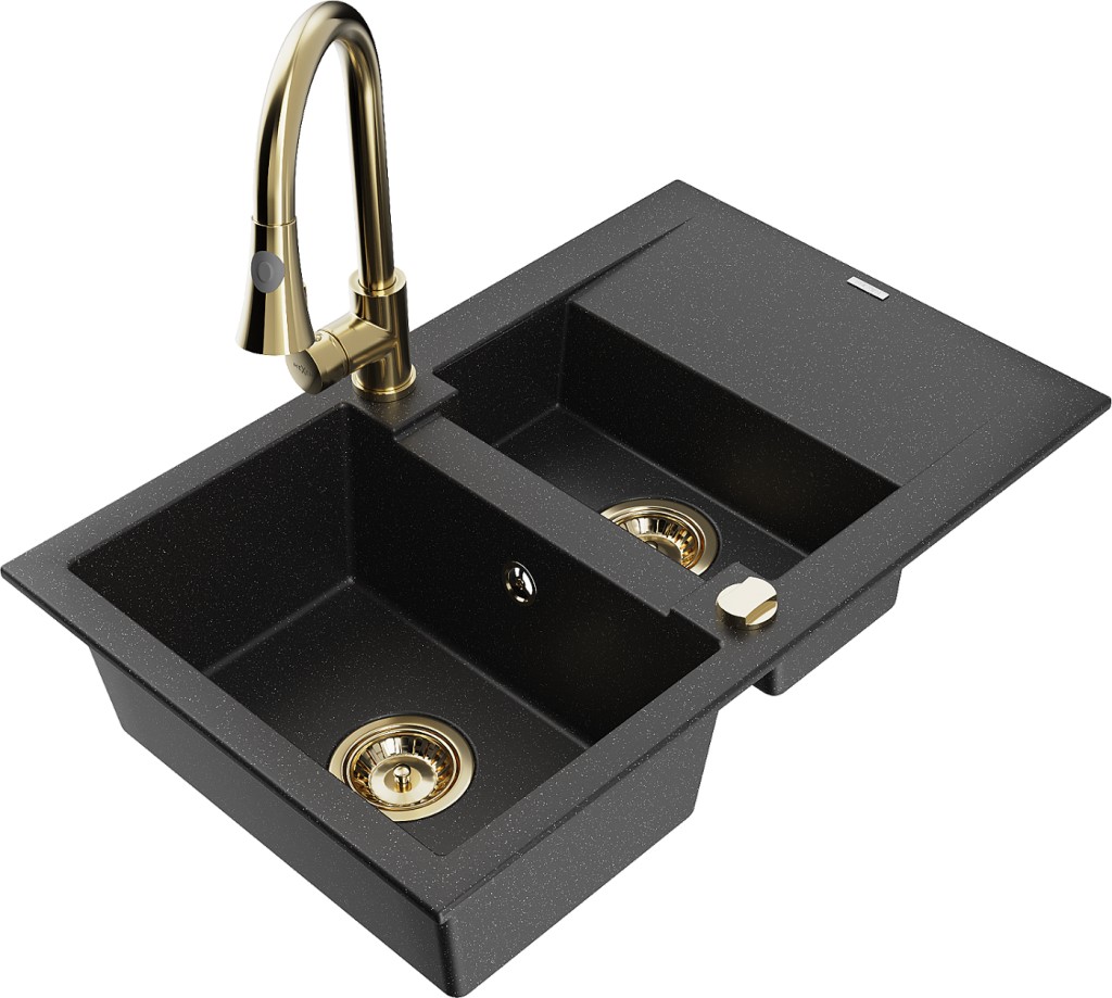 Technické dáta: drez: Rozmer: 737x475x177mm Hĺbka komory: 167 mm (väčšia), 107 mm (menšia) Rozmery komory: 395x272 mm (väčšie), (menšie) 375x182 mm Priemer odtoku: ø90 mm Typ: 1,5-miska s krátkym odkvapkávačom Typ: Zapustené do pracovnej dosky Farba: čierna/strieborná metalíza Povrchová úprava sifónu: zlatá Materiál: žula (80% žulové kamenivo, 20% živice) Prepadový otvor: Áno Otvory: (batérie, automatické) 2 Inštalácia: Univerzálna, je možné inštalovať s odkvapkávačom na ľavú alebo pravú stranu Vysoká odolnosť proti poškriabaniu a zmene farby Odolnosť proti tepelným šokom Ľahko čistiteľný povrch kuchynská batéria: Materiál: mosadz Farba: Zlatá Hlava: Keramická Prevzdušňovač: Áno Typ: Jedna páka Výška batérie: 380 mm Rozsah výtoku: 252 mm Typ výtoku: Výsuvný(GT) Ean: 5905315029195