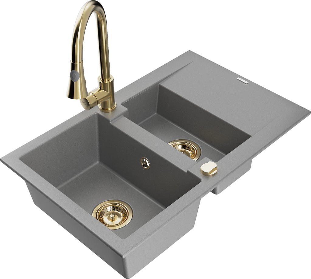 Technické dáta: Drez: Rozmer: 737x475x177 mm Hĺbka komory: 167 mm (väčšia), 107 mm (menšia) Rozmery komory: 395x272 mm (väčšie), (menšie) 375x182 mm Priemer odtoku: ø90 mm Typ: 1,5-miska s krátkym odkvapkávačom Typ: Zapustené do pracovnej dosky Šedá farba Povrchová úprava sifónu: zlatá Materiál: žula (80% žulové kamenivo 20% živice) Prepadový otvor: Áno Otvory: (batérie, automat) 2 Inštalácia: Univerzálna, je možné inštalovať s odkvapkávačom na ľavú alebo pravú stranu Vysoká odolnosť proti poškriabaniu a zmene farby Odolnosť proti tepelným šokom Povrch pre ľahké čistenie Kuchynská batéria: Materiál: mosadz Farba: Zlatá Hlava: Keramická Perlátor: Áno Typ: Jednopákové Výška batérie: 380 mm Rozsah výtoku: 252 mm Typ výtoku: Výsuvný(GT) Ean: 5905315029140