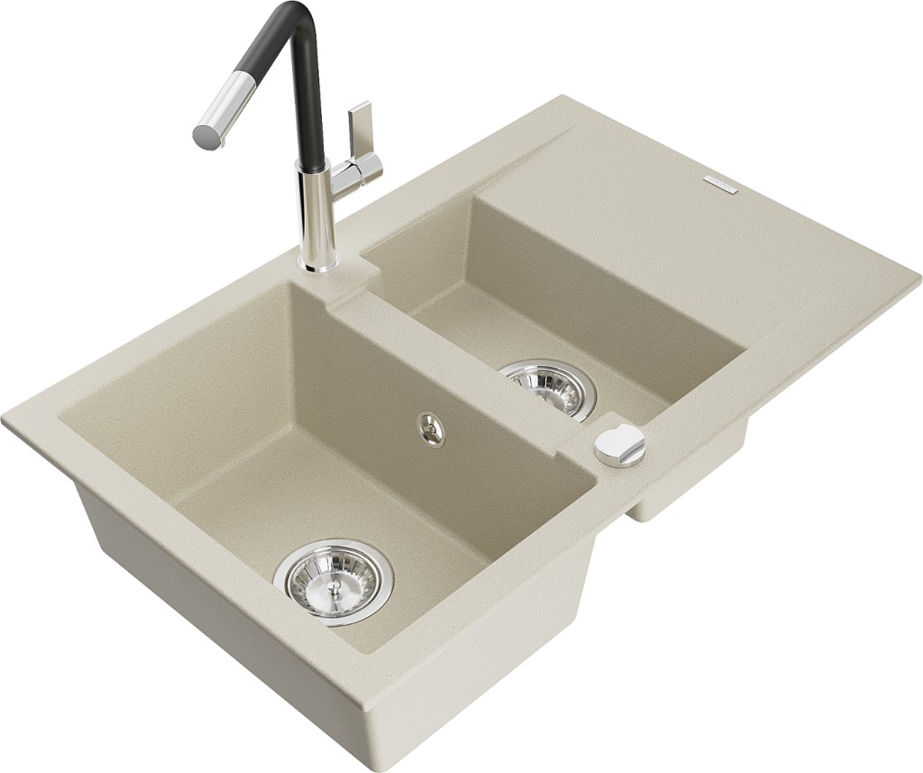 Technické dáta: Drez: Rozmer: 737x475x177 mm Hĺbka komory: 167 mm (väčšia), 107 mm (menšia) Rozmery komory: 395x272 mm (väčšie), (menšie) 375x182 mm Priemer odtoku: ø90 mm Typ: 1,5-miska s krátkym odkvapkávačom Typ: Zapustené do pracovnej dosky Farba béžová Povrchová úprava sifónu: Chrome Materiál: žula (80% žulové kamenivo 20% živice) Prepadový otvor: Áno Otvory: (batérie, automat) 2 Inštalácia: Univerzálna, je možné inštalovať s odkvapkávačom na ľavú alebo pravú stranu Vysoká odolnosť proti poškriabaniu a zmene farby Odolnosť proti tepelným šokom Povrch pre ľahké čistenie Kuchynská batéria: Materiál: mosadz Farba: chróm/čierna Hlava: Keramická Perlátor: Áno Typ: Jednopáková Rozsah výtoku: 245 mm Výška batérie: 307 mm(GT) Ean: 5905315059048