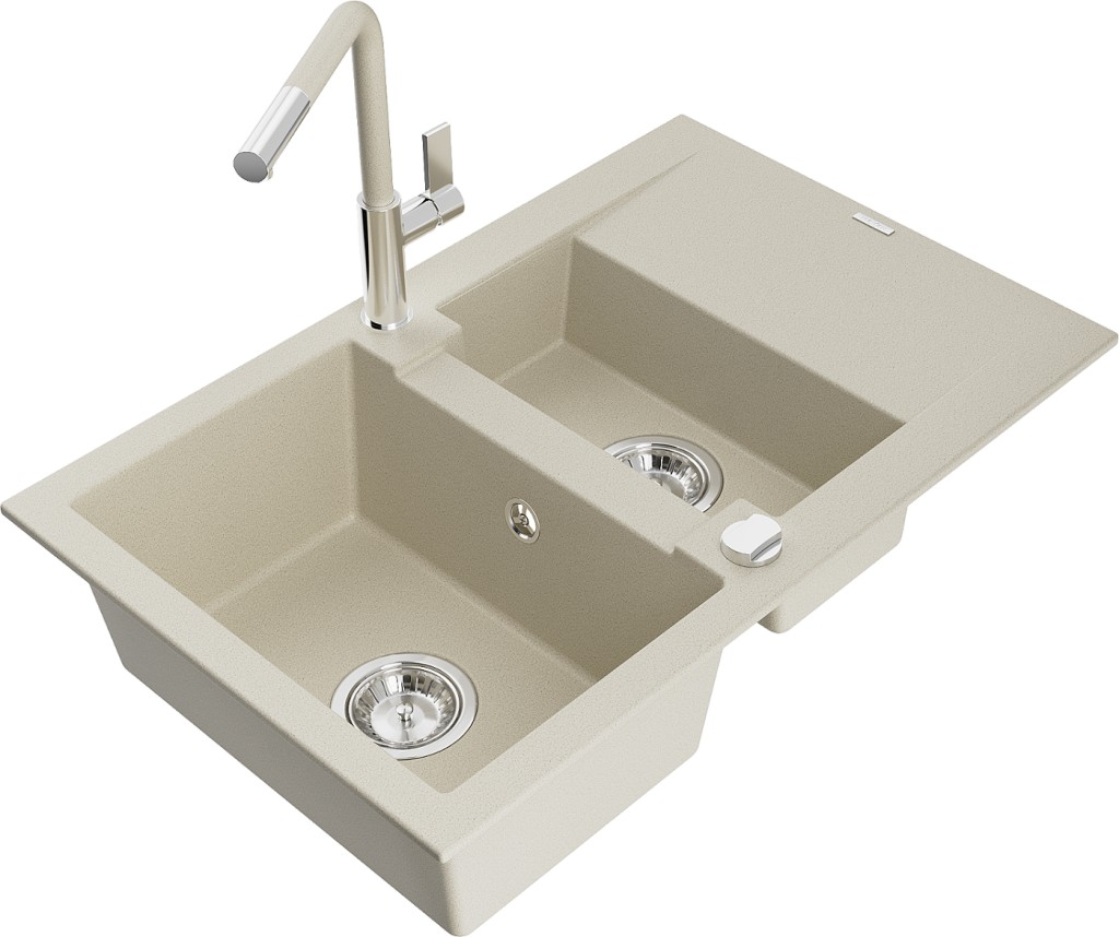 Technické dáta: Drez: Rozmer: 737x475x177 mm Hĺbka komory: 167 mm (väčšia), 107 mm (menšia) Rozmery komory: 395x272 mm (väčšie), (menšie) 375x182 mm Priemer odtoku: ø90 mm Typ: 1,5-miska s krátkym odkvapkávačom Typ: Zapustené do pracovnej dosky Farba béžová Povrchová úprava sifónu: Chrome Materiál: žula (80% žulové kamenivo 20% živice) Prepadový otvor: Áno Otvory: (batérie, automat) 2 Inštalácia: Univerzálna, je možné inštalovať s odkvapkávačom na ľavú alebo pravú stranu Vysoká odolnosť proti poškriabaniu a zmene farby Odolnosť proti tepelným šokom Povrch pre ľahké čistenie Kuchynská batéria: Materiál: mosadz Farba: chróm/béžová Hlava: Keramická Perlátor: Áno Typ: Jednopákové Rozsah výtoku: 245 mm Výška batérie: 307 mm(GT) Ean: 5905315059062
