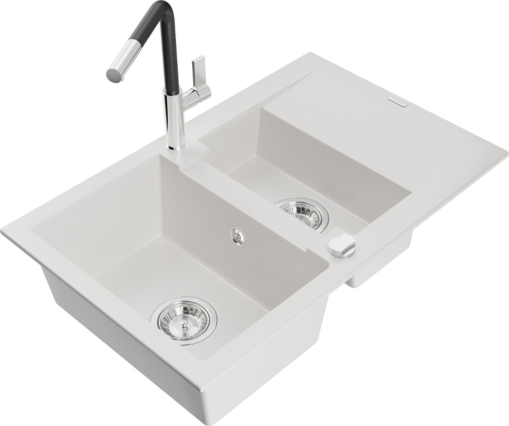 Technické dáta: drez: Rozmer: 737x475x177mm Hĺbka komory: 167 mm (väčšia), 107 mm (menšia) Rozmery komory: 395x272 mm (väčšie), (menšie) 375x182 mm Priemer odtoku: ø90 mm Typ: 1,5-miska s krátkym odkvapkávačom Typ: Zapustené do pracovnej dosky biela farba Povrchová úprava sifónu: Chrome Materiál: žula (80% žulové kamenivo, 20% živice) Prepadový otvor: Áno Otvory: (batérie, automatické) 2 Inštalácia: Univerzálna, je možné inštalovať s odkvapkávačom na ľavú alebo pravú stranu Vysoká odolnosť proti poškriabaniu a zmene farby Odolnosť proti tepelným šokom Ľahko čistiteľný povrch kuchynská batéria: Materiál: mosadz Farba: chróm/čierna Hlava: Keramická Prevzdušňovač: Áno Typ: Jedna páka Rozsah výtoku: 245 mm Výška batérie: 307 mm(GT) Ean: 5905315058980
