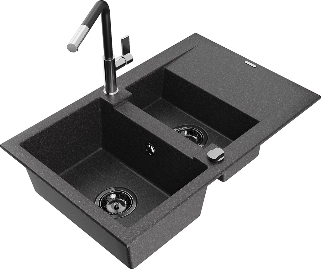 Technické dáta: drez: Rozmer: 737x475x177mm Hĺbka komory: 167 mm (väčšia), 107 mm (menšia) Rozmery komory: 395x272 mm (väčšie), (menšie) 375x182 mm Priemer odtoku: ø90 mm Typ: 1,5-miska s krátkym odkvapkávačom Typ: Zapustené do pracovnej dosky Farba: Škvrnitá čierna Povrchová úprava sifónu: čierna Materiál: žula (80% žulové kamenivo, 20% živice) Prepadový otvor: Áno Otvory: (batérie, automatické) 2 Inštalácia: Univerzálna, je možné inštalovať s odkvapkávačom na ľavú alebo pravú stranu Vysoká odolnosť proti poškriabaniu a zmene farby Odolnosť proti tepelným šokom Ľahko čistiteľný povrch kuchynská batéria: Materiál: mosadz Farba: chróm/čierna Hlava: Keramická Prevzdušňovač: Áno Typ: Jedna páka Rozsah výtoku: 245 mm Výška batérie: 307 mm(GT) Ean: 5905315059314
