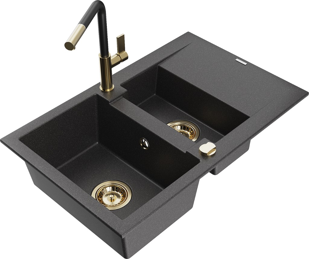 Technické dáta: drez: Rozmer: 737x475x177mm Hĺbka komory: 167 mm (väčšia), 107 mm (menšia) Rozmery komory: 395x272 mm (väčšie), (menšie) 375x182 mm Priemer odtoku: ø90 mm Typ: 1,5-miska s krátkym odkvapkávačom Typ: Zapustené do pracovnej dosky Farba: Škvrnitá čierna Povrchová úprava sifónu: zlatá Materiál: žula (80% žulové kamenivo, 20% živice) Prepadový otvor: Áno Otvory: (batérie, automatické) 2 Inštalácia: Univerzálna, je možné inštalovať s odkvapkávačom na ľavú alebo pravú stranu Vysoká odolnosť proti poškriabaniu a zmene farby Odolnosť proti tepelným šokom Ľahko čistiteľný povrch kuchynská batéria: Materiál: mosadz Farba: Zlatá/Čierna Hlava: Keramická Prevzdušňovač: Áno Typ: Jedna páka Rozsah výtoku: 245 mm Výška batérie: 307 mm(GT) Ean: 5905315059345