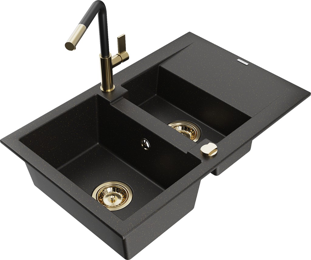 Technické dáta: drez: Rozmer: 737x475x177mm Hĺbka komory: 167 mm (väčšia), 107 mm (menšia) Rozmery komory: 395x272 mm (väčšie), (menšie) 375x182 mm Priemer odtoku: ø90 mm Typ: 1,5-komorový s krátkym odkvapkávačom Typ: Zapustené do pracovnej dosky Farba: čierna / zlatá metalíza Povrchová úprava sifónu: zlatá Materiál: žula (80% žulové kamenivo, 20% živice) Prepadový otvor: Áno Otvory: (batérie, automatické) 2 Inštalácia: Univerzálna, je možné inštalovať s odkvapkávačom na ľavú alebo pravú stranu Vysoká odolnosť proti poškriabaniu a zmene farby Odolnosť proti tepelným šokom Ľahko čistiteľný povrch kuchynská batéria: Materiál: mosadz Farba: Zlatá/Čierna Hlava: Keramická Prevzdušňovač: Áno Typ: Jedna páka Rozsah výtoku: 245 mm Výška batérie: 307 mm(GT) Ean: 5905315059260
