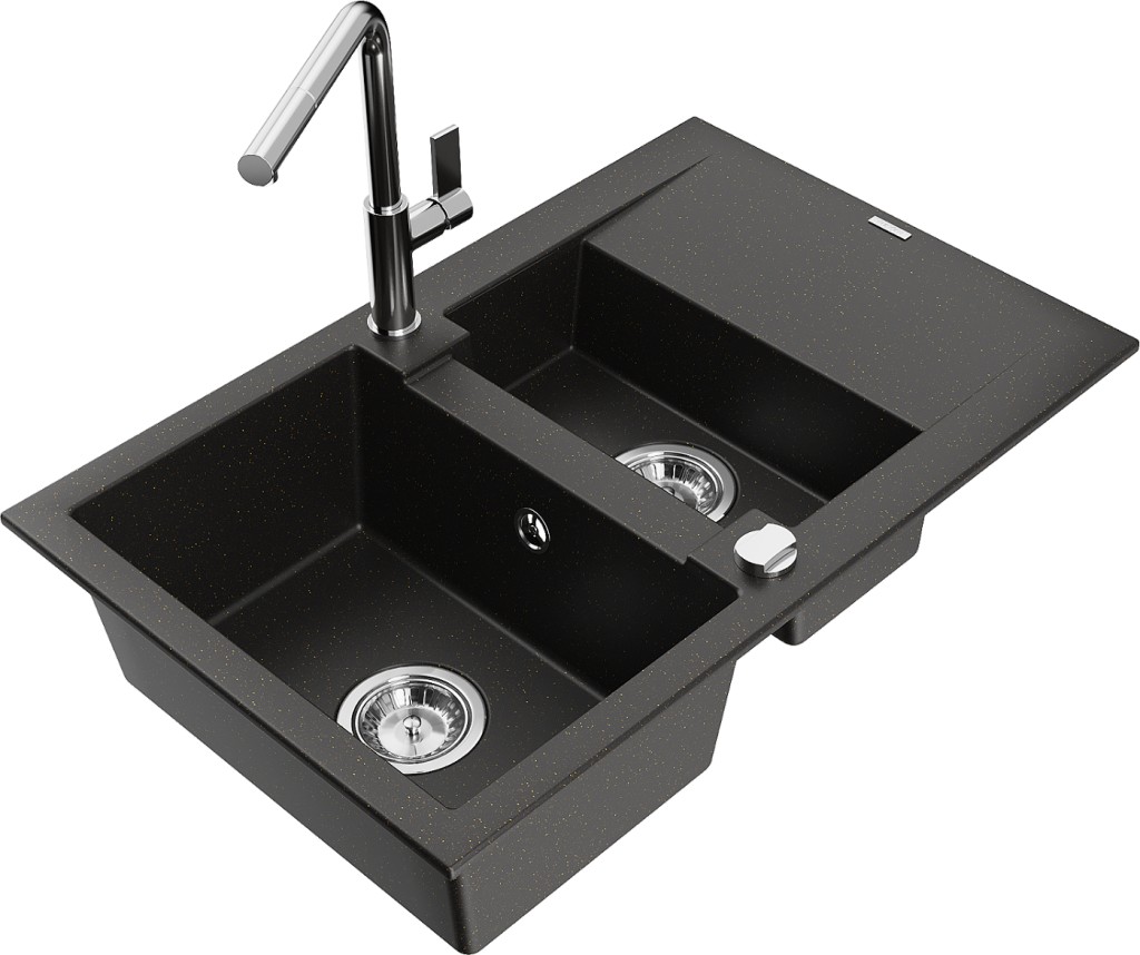 Technické dáta: drez: Rozmer: 737x475x177mm Hĺbka komory: 167 mm (väčšia), 107 mm (menšia) Rozmery komory: 395x272 mm (väčšie), (menšie) 375x182 mm Priemer odtoku: ø90 mm Typ: 1,5-komorový s krátkym odkvapkávačom Typ: Zapustené do pracovnej dosky Farba: čierna / zlatá metalíza Povrchová úprava sifónu: Chrome Materiál: žula (80% žulové kamenivo, 20% živice) Prepadový otvor: Áno Otvory: (batérie, automatické) 2 Inštalácia: Univerzálna, je možné inštalovať s odkvapkávačom na ľavú alebo pravú stranu Vysoká odolnosť proti poškriabaniu a zmene farby Odolnosť proti tepelným šokom Ľahko čistiteľný povrch kuchynská batéria: Materiál: mosadz Farba: Chrome Hlava: Keramická Prevzdušňovač: Áno Typ: Jedna páka Rozsah výtoku: 245 mm Výška batérie: 307 mm(GT) Ean: 5905315059239