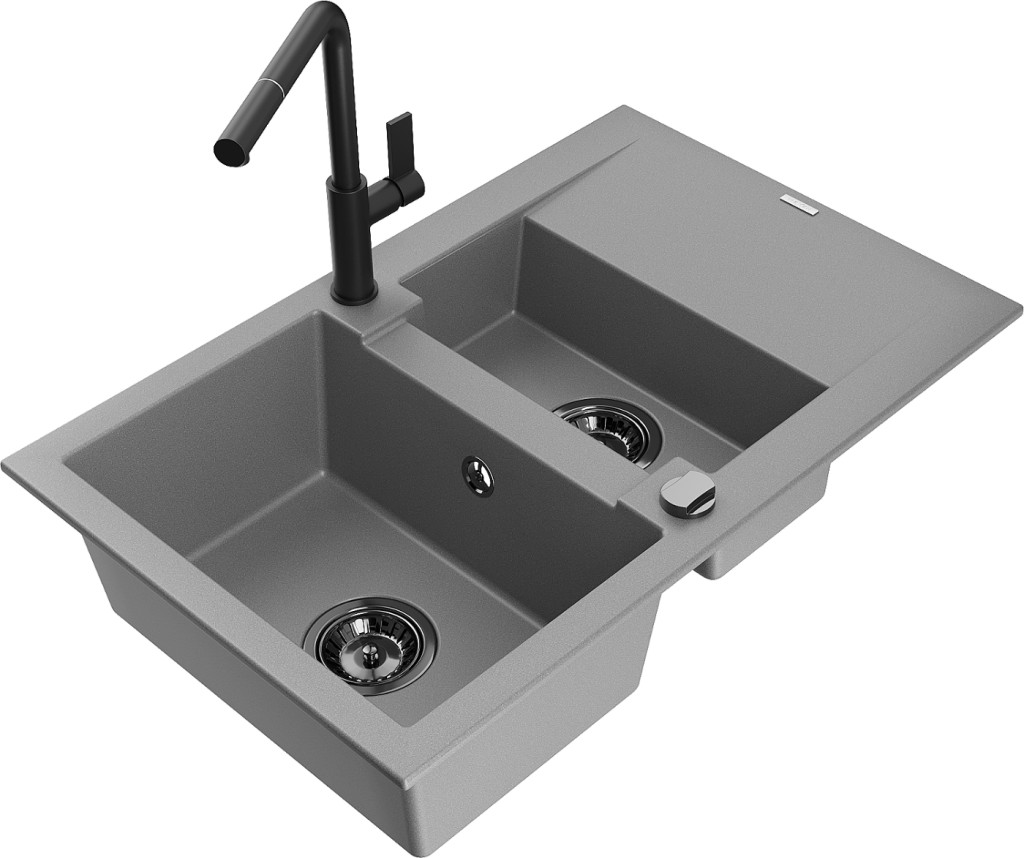 Technické dáta: Drez: Rozmer: 737x475x177 mm Hĺbka komory: 167 mm (väčšia), 107 mm (menšia) Rozmery komory: 395x272 mm (väčšie), (menšie) 375x182 mm Priemer odtoku: ø90 mm Typ: 1,5-miska s krátkym odkvapkávačom Typ: Zapustené do pracovnej dosky Šedá farba Povrchová úprava sifónu: čierna Materiál: žula (80% žulové kamenivo 20% živice) Prepadový otvor: Áno Otvory: (batérie, automat) 2 Inštalácia: Univerzálna, je možné inštalovať s odkvapkávačom na ľavú alebo pravú stranu Vysoká odolnosť proti poškriabaniu a zmene farby Odolnosť proti tepelným šokom Povrch pre ľahké čistenie Kuchynská batéria: Materiál: mosadz Čierna farba Hlava: Keramická Perlátor: Áno Typ: Jednopákové Rozsah výtoku: 245 mm Výška batérie: 307 mm(GT) Ean: 5905315059161