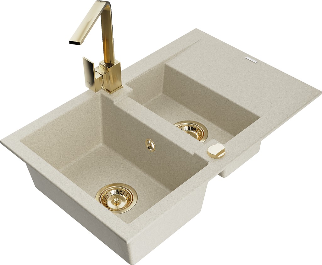 Technické dáta: Drez: Rozmer: 737x475x177 mm Hĺbka komory: 167 mm (väčšia), 107 mm (menšia) Rozmery komory: 395x272 mm (väčšie), (menšie) 375x182 mm Priemer odtoku: ø90 mm Typ: 1,5-miska s krátkym odkvapkávačom Typ: Zapustené do pracovnej dosky Farba béžová Povrchová úprava sifónu: zlatá Materiál: žula (80% žulové kamenivo 20% živice) Prepadový otvor: Áno Otvory: (batérie, automat) 2 Inštalácia: Univerzálna, je možné inštalovať s odkvapkávačom na ľavú alebo pravú stranu Vysoká odolnosť proti poškriabaniu a zmene farby Odolnosť proti tepelným šokom Povrch pre ľahké čistenie Kuchynská batéria: Materiál: mosadz Farba: Zlatá Hlava: Keramická Perlátor: Áno Typ: Jednopákové Výška batérie: 290 mm Rozsah výtoku: 220 mm(GT) Ean: 5905315018878