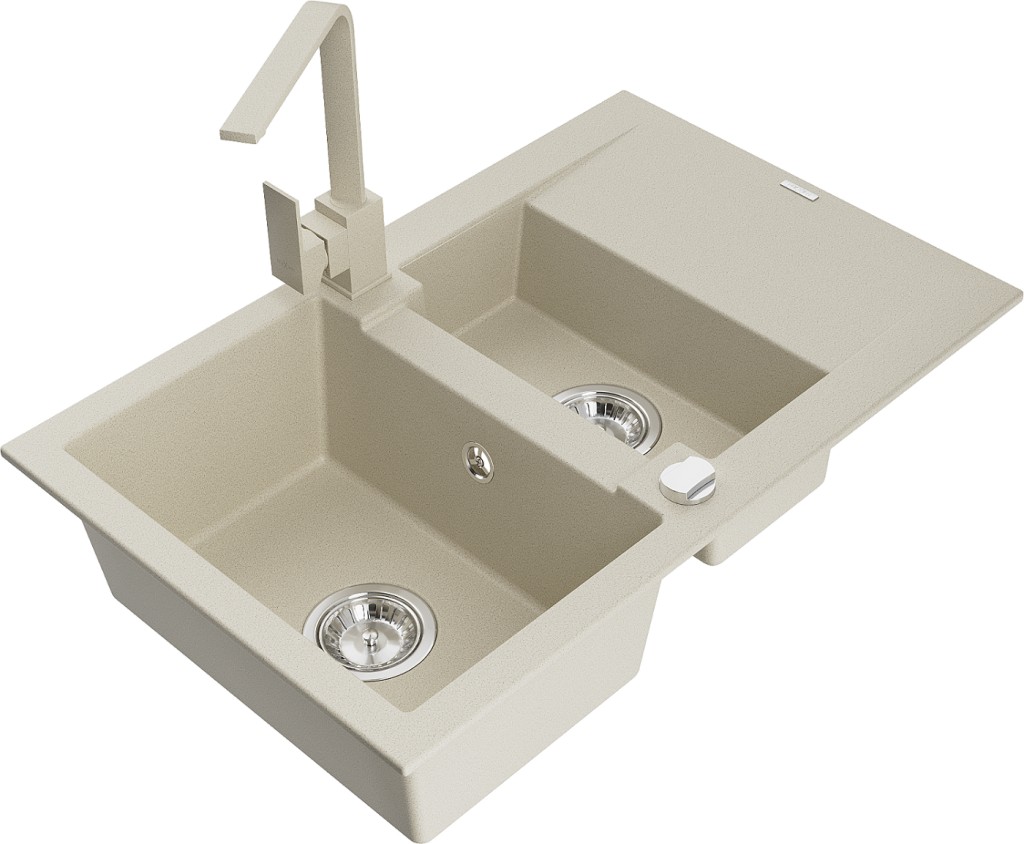 Technické dáta: Drez: Rozmer: 737x475x177 mm Hĺbka komory: 167 mm (väčšia), 107 mm (menšia) Rozmery komory: 395x272 mm (väčšie), (menšie) 375x182 mm Priemer odtoku: ø90 mm Typ: 1,5-miska s krátkym odkvapkávačom Typ: Zapustené do pracovnej dosky Farba béžová Povrchová úprava sifónu: Chrome Materiál: žula (80% žulové kamenivo 20% živice) Prepadový otvor: Áno Otvory: (batérie, automat) 2 Inštalácia: Univerzálna, je možné inštalovať s odkvapkávačom na ľavú alebo pravú stranu Vysoká odolnosť proti poškriabaniu a zmene farby Odolnosť proti tepelným šokom Povrch pre ľahké čistenie Kuchynská batéria: Materiál: mosadz Farba béžová Hlava: Keramická Perlátor: Áno Typ: Jednopáková Výška batérie: 290 mm Rozsah výtoku: 220 mm(GT) Ean: 5905315018861