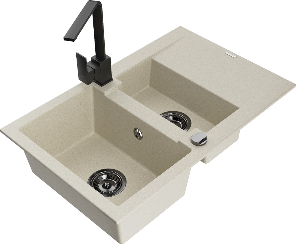 Technické dáta: Drez: Rozmer: 737x475x177 mm Hĺbka komory: 167 mm (väčšia), 107 mm (menšia) Rozmery komory: 395x272 mm (väčšie), (menšie) 375x182 mm Priemer odtoku: ø90 mm Typ: 1,5-miska s krátkym odkvapkávačom Typ: Zapustené do pracovnej dosky Farba béžová Povrchová úprava sifónu: čierna Materiál: žula (80% žulové kamenivo 20% živice) Prepadový otvor: Áno Otvory: (batérie, automat) 2 Inštalácia: Univerzálna, je možné inštalovať s odkvapkávačom na ľavú alebo pravú stranu Vysoká odolnosť proti poškriabaniu a zmene farby Odolnosť proti tepelným šokom Povrch pre ľahké čistenie Kuchynská batéria: Materiál: mosadz Čierna farba Hlava: Keramická Perlátor: Áno Typ: Jednopáková Výška batérie: 290 mm Rozsah výtoku: 220 mm(GT) Ean: 5905315018885