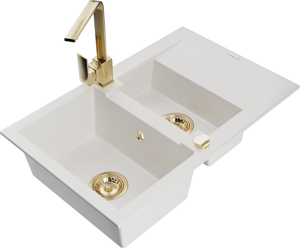 Technické dáta: drez: Rozmer: 737x475x177mm Hĺbka komory: 167 mm (väčšia), 107 mm (menšia) Rozmery komory: 395x272 mm (väčšie), (menšie) 375x182 mm Priemer odtoku: ø90 mm Typ: 1,5-komorový s krátkym odkvapkávačom Typ: Zapustené do pracovnej dosky biela farba Povrchová úprava sifónu: zlatá Materiál: žula (80% žulové kamenivo, 20% živice) Prepadový otvor: Áno Otvory: (batérie, automatické) 2 Inštalácia: Univerzálna, je možné inštalovať s odkvapkávačom na ľavú alebo pravú stranu Vysoká odolnosť proti poškriabaniu a zmene farby Odolnosť proti tepelným šokom Ľahko čistiteľný povrch kuchynská batéria: Materiál: mosadz Farba: Zlatá Hlava: Keramická Prevzdušňovač: Áno Typ: Jedna páka Výška batérie: 290 mm Rozsah výtoku: 220 mm(GT) Ean: 5905315018830