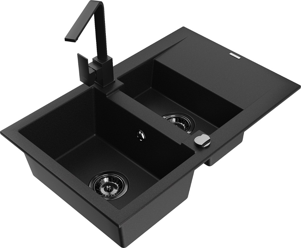 Technické dáta: drez: Rozmer: 737x475x177mm Hĺbka komory: 167 mm (väčšia), 107 mm (menšia) Rozmery komory: 395x272 mm (väčšie), (menšie) 375x182 mm Priemer odtoku: ø90 mm Typ: 1,5-komorový s krátkym odkvapkávačom Typ: Zapustené do pracovnej dosky Čierna farba Povrchová úprava sifónu: čierna Materiál: žula (80% žulové kamenivo, 20% živice) Prepadový otvor: Áno Otvory: (batérie, automatické) 2 Inštalácia: Univerzálna, je možné inštalovať s odkvapkávačom na ľavú alebo pravú stranu Vysoká odolnosť proti poškriabaniu a zmene farby Odolnosť proti tepelným šokom Ľahko čistiteľný povrch kuchynská batéria: Materiál: mosadz Čierna farba Hlava: Keramická Prevzdušňovač: Áno Typ: Jedna páka Výška batérie: 290 mm Rozsah výtoku: 220 mm(GT) Ean: 5905315019110