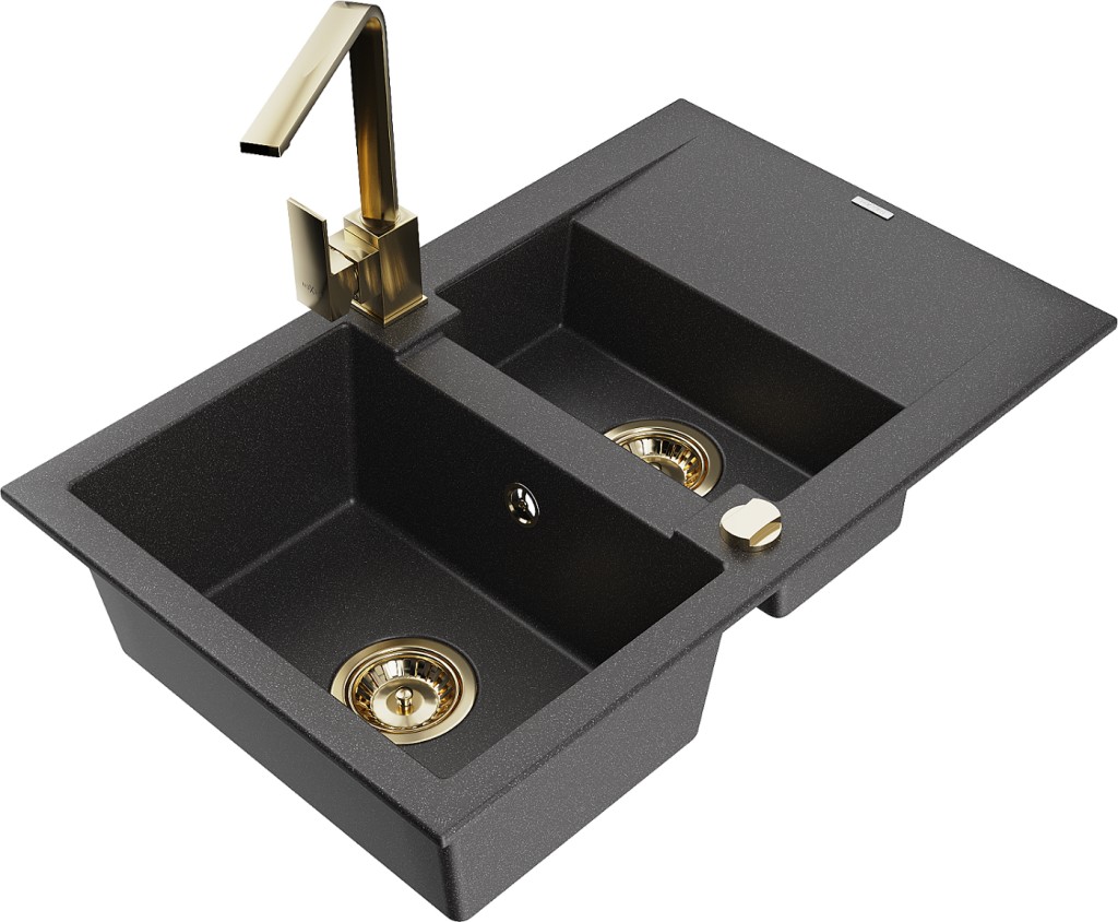 Technické dáta: drez: Rozmer: 737x475x177mm Hĺbka komory: 167 mm (väčšia), 107 mm (menšia) Rozmery komory: 395x272 mm (väčšie), (menšie) 375x182 mm Priemer odtoku: ø90 mm Typ: 1,5-miska s krátkym odkvapkávačom Typ: Zapustené do pracovnej dosky Farba: Škvrnitá čierna Povrchová úprava sifónu: zlatá Materiál: žula (80% žulové kamenivo, 20% živice) Prepadový otvor: Áno Otvory: (batérie, automatické) 2 Inštalácia: Univerzálna, je možné inštalovať s odkvapkávačom na ľavú alebo pravú stranu Vysoká odolnosť proti poškriabaniu a zmene farby Odolnosť proti tepelným šokom Ľahko čistiteľný povrch kuchynská batéria: Materiál: mosadz Farba: Zlatá Hlava: Keramická Prevzdušňovač: Áno Typ: Jedna páka Výška batérie: 290 mm Rozsah výtoku: 220 mm(GT) Ean: 5905315019042