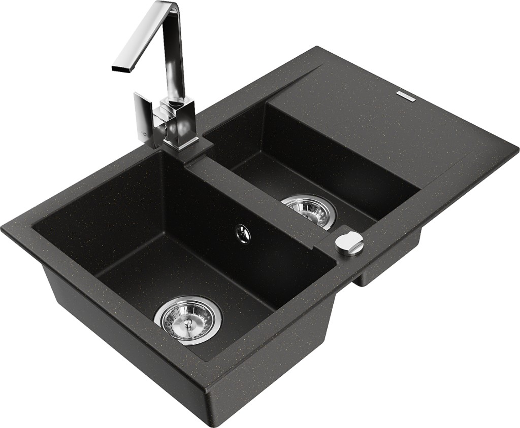 Technické dáta: drez: Rozmer: 737x475x177mm Hĺbka komory: 167 mm (väčšia), 107 mm (menšia) Rozmery komory: 395x272 mm (väčšie), (menšie) 375x182 mm Priemer odtoku: ø90 mm Typ: 1,5-komorový s krátkym odkvapkávačom Typ: Zapustené do pracovnej dosky Farba: čierna / zlatá metalíza Povrchová úprava sifónu: Chrome Materiál: žula (80% žulové kamenivo, 20% živice) Prepadový otvor: Áno Otvory: (batérie, automatické) 2 Inštalácia: Univerzálna, je možné inštalovať s odkvapkávačom na ľavú alebo pravú stranu Vysoká odolnosť proti poškriabaniu a zmene farby Odolnosť proti tepelným šokom Ľahko čistiteľný povrch kuchynská batéria: Materiál: mosadz Farba: Chrome Hlava: Keramická Prevzdušňovač: Áno Typ: Jedna páka Výška batérie: 290 mm Rozsah výtoku: 220 mm(GT) Ean: 5905315018984