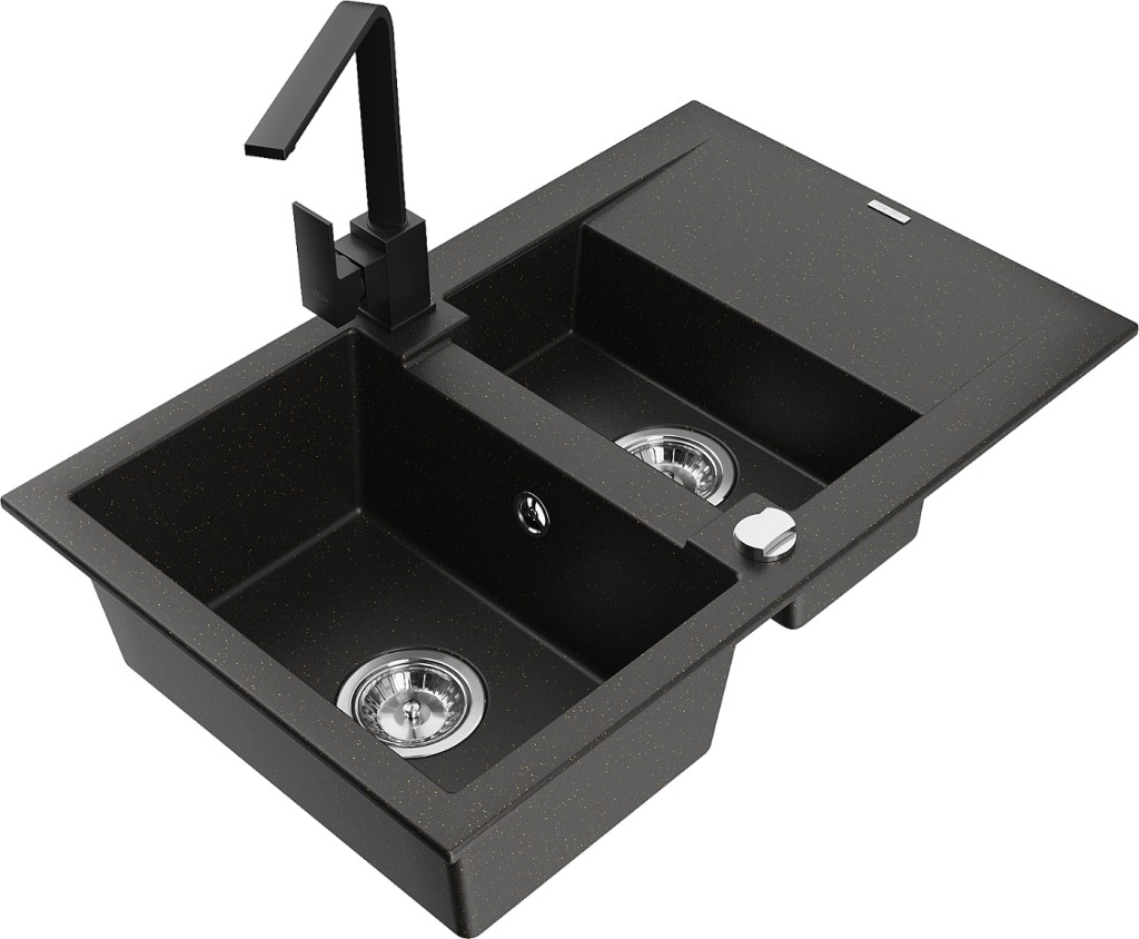 Technické dáta: drez: Rozmer: 737x475x177mm Hĺbka komory: 167 mm (väčšia), 107 mm (menšia) Rozmery komory: 395x272 mm (väčšie), (menšie) 375x182 mm Priemer odtoku: ø90 mm Typ: 1,5-komorový s krátkym odkvapkávačom Typ: Zapustené do pracovnej dosky Farba: čierna / zlatá metalíza Povrchová úprava sifónu: Chrome Materiál: žula (80% žulové kamenivo, 20% živice) Prepadový otvor: Áno Otvory: (batérie, automatické) 2 Inštalácia: Univerzálna, je možné inštalovať s odkvapkávačom na ľavú alebo pravú stranu Vysoká odolnosť proti poškriabaniu a zmene farby Odolnosť proti tepelným šokom Ľahko čistiteľný povrch kuchynská batéria: Materiál: mosadz Čierna farba Hlava: Keramická Prevzdušňovač: Áno Typ: Jedna páka Výška batérie: 290 mm Rozsah výtoku: 220 mm(GT) Ean: 5905315019011