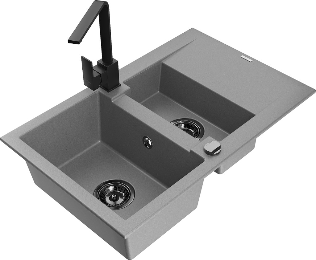 Technické dáta: Drez: Rozmer: 737x475x177 mm Hĺbka komory: 167 mm (väčšia), 107 mm (menšia) Rozmery komory: 395x272 mm (väčšie), (menšie) 375x182 mm Priemer odtoku: ø90 mm Typ: 1,5-miska s krátkym odkvapkávačom Typ: Zapustené do pracovnej dosky Šedá farba Povrchová úprava sifónu: čierna Materiál: žula (80% žulové kamenivo 20% živice) Prepadový otvor: Áno Otvory: (batérie, automat) 2 Inštalácia: Univerzálna, je možné inštalovať s odkvapkávačom na ľavú alebo pravú stranu Vysoká odolnosť proti poškriabaniu a zmene farby Odolnosť proti tepelným šokom Povrch pre ľahké čistenie Kuchynská batéria: Materiál: mosadz Čierna farba Hlava: Keramická Perlátor: Áno Typ: Jednopákové Výška batérie: 290 mm Rozsah výtoku: 220 mm(GT) Ean: 5905315018922