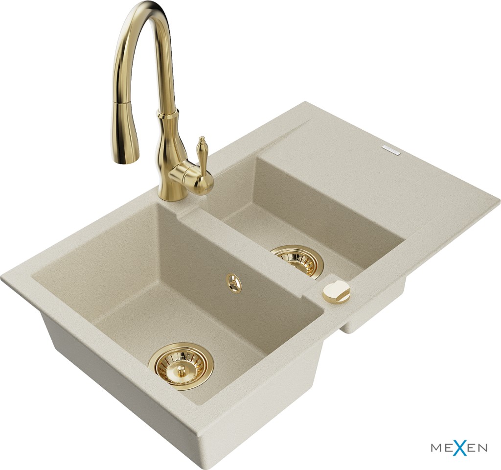 Technické dáta: Drez: Rozmer: 737x475x177 mm Hĺbka komory: 167 mm (väčšia), 107 mm (menšia) Rozmery komory: 395x272 mm (väčšie), (menšie) 375x182 mm Priemer odtoku: ø90 mm Typ: 1,5-miska s krátkym odkvapkávačom Typ: Zapustené do pracovnej dosky Farba béžová Povrchová úprava sifónu: zlatá Materiál: žula (80% žulové kamenivo 20% živice) Prepadový otvor: Áno Otvory: (batérie, automat) 2 Inštalácia: Univerzálna, je možné inštalovať s odkvapkávačom na ľavú alebo pravú stranu Vysoká odolnosť proti poškriabaniu a zmene farby Odolnosť proti tepelným šokom Povrch pre ľahké čistenie Kuchynská batéria: Materiál: mosadz Farba: Zlatá Hlava: Keramická Perlátor: Áno Typ: Jednopákové Výška batérie: 410 mm Rozsah výtoku: 231 mm(GT) Ean: 5905315034236