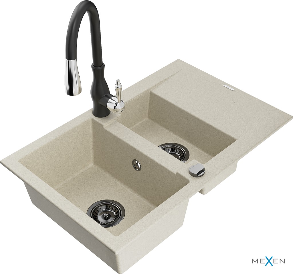 Technické dáta: Drez: Rozmer: 737x475x177 mm Hĺbka komory: 167 mm (väčšia), 107 mm (menšia) Rozmery komory: 395x272 mm (väčšie), (menšie) 375x182 mm Priemer odtoku: ø90 mm Typ: 1,5-miska s krátkym odkvapkávačom Typ: Zapustené do pracovnej dosky Farba béžová Povrchová úprava sifónu: čierna Materiál: žula (80% žulové kamenivo 20% živice) Prepadový otvor: Áno Otvory: (batérie, automat) 2 Inštalácia: Univerzálna, je možné inštalovať s odkvapkávačom na ľavú alebo pravú stranu Vysoká odolnosť proti poškriabaniu a zmene farby Odolnosť proti tepelným šokom Povrch pre ľahké čistenie Kuchynská batéria: Materiál: mosadz Čierna farba Hlava: Keramická Perlátor: Áno Typ: Jednopákové Výška batérie: 410 mm Rozsah výtoku: 231 mm(GT) Ean: 5905315034243