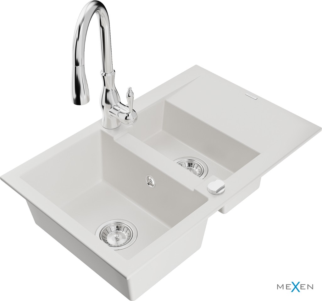 Technické dáta: drez: Rozmer: 737x475x177mm Hĺbka komory: 167 mm (väčšia), 107 mm (menšia) Rozmery komory: 395x272 mm (väčšie), (menšie) 375x182 mm Priemer odtoku: ø90 mm Typ: 1,5-komorový s krátkym odkvapkávačom Typ: Zapustené do pracovnej dosky biela farba Povrchová úprava sifónu: Chrome Materiál: žula (80% žulové kamenivo, 20% živice) Prepadový otvor: Áno Otvory: (batérie, automatické) 2 Inštalácia: Univerzálna, je možné inštalovať s odkvapkávačom na ľavú alebo pravú stranu Vysoká odolnosť proti poškriabaniu a zmene farby Odolnosť proti tepelným šokom Ľahko čistiteľný povrch kuchynská batéria: Materiál: mosadz Farba: Chrome Hlava: Keramická Prevzdušňovač: Áno Typ: Jedna páka Výška batérie: 410 mm Rozsah výtoku: 231 mm(GT) Ean: 5905315034175