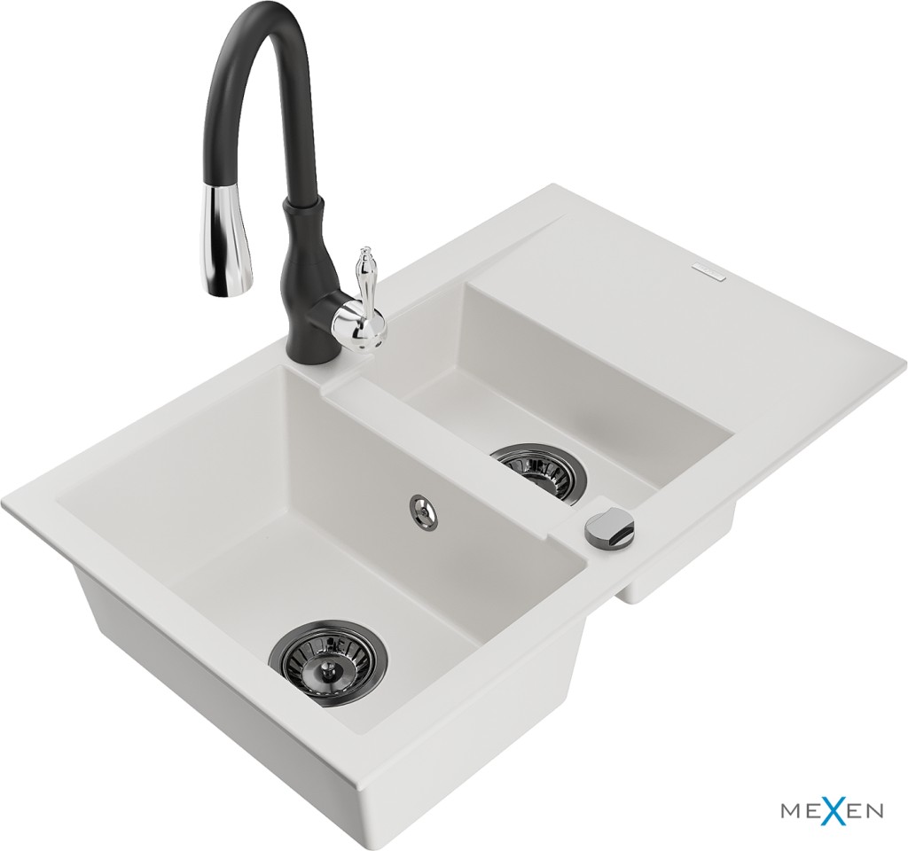 Technické dáta: drez: Rozmer: 737x475x177mm Hĺbka komory: 167 mm (väčšia), 107 mm (menšia) Rozmery komory: 395x272 mm (väčšie), (menšie) 375x182 mm Priemer odtoku: ø90 mm Typ: 1,5-komorový s krátkym odkvapkávačom Typ: Zapustené do pracovnej dosky biela farba Povrchová úprava sifónu: zlatá Materiál: žula (80% žulové kamenivo, 20% živice) Prepadový otvor: Áno Otvory: (batérie, automatické) 2 Inštalácia: Univerzálna, je možné inštalovať s odkvapkávačom na ľavú alebo pravú stranu Vysoká odolnosť proti poškriabaniu a zmene farby Odolnosť proti tepelným šokom Ľahko čistiteľný povrch kuchynská batéria: Materiál: mosadz Farba: Zlatá Hlava: Keramická Prevzdušňovač: Áno Typ: Jedna páka Výška batérie: 410 mm Rozsah výtoku: 231 mm(GT) Ean: 5905315034205