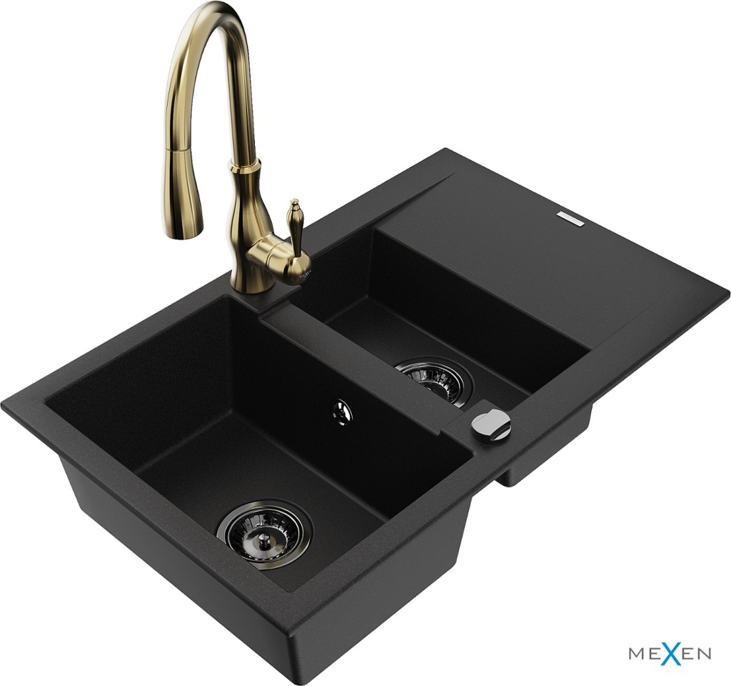 Technické dáta: drez: Rozmer: 737x475x177mm Hĺbka komory: 167 mm (väčšia), 107 mm (menšia) Rozmery komory: 395x272 mm (väčšie), (menšie) 375x182 mm Priemer odtoku: ø90 mm Typ: 1,5-komorový s krátkym odkvapkávačom Typ: Zapustené do pracovnej dosky Čierna farba Povrchová úprava sifónu: čierna Materiál: žula (80% žulové kamenivo, 20% živice) Prepadový otvor: Áno Otvory: (batérie, automatické) 2 Inštalácia: Univerzálna, je možné inštalovať s odkvapkávačom na ľavú alebo pravú stranu Vysoká odolnosť proti poškriabaniu a zmene farby Odolnosť proti tepelným šokom Ľahko čistiteľný povrch kuchynská batéria: Materiál: mosadz Farba: Zlatá Hlava: Keramická Prevzdušňovač: Áno Typ: Jedna páka Výška batérie: 410 mm Rozsah výtoku: 231 mm(GT) Ean: 5905315034465