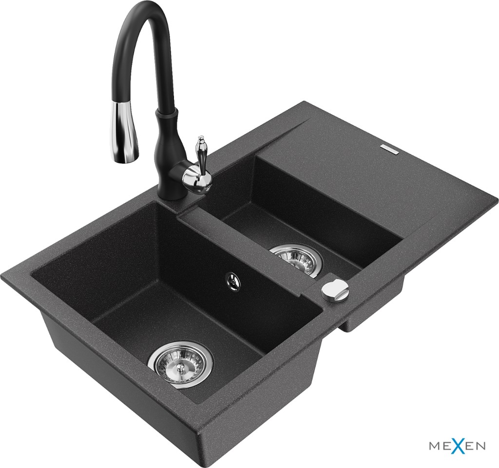 Technické dáta: drez: Rozmer: 737x475x177mm Hĺbka komory: 167 mm (väčšia), 107 mm (menšia) Rozmery komory: 395x272 mm (väčšie), (menšie) 375x182 mm Priemer odtoku: ø90 mm Typ: 1,5-miska s krátkym odkvapkávačom Typ: Zapustené do pracovnej dosky Farba: Škvrnitá čierna Povrchová úprava sifónu: Chrome Materiál: žula (80% žulové kamenivo, 20% živice) Prepadový otvor: Áno Otvory: (batérie, automatické) 2 Inštalácia: Univerzálna, je možné inštalovať s odkvapkávačom na ľavú alebo pravú stranu Vysoká odolnosť proti poškriabaniu a zmene farby Odolnosť proti tepelným šokom Ľahko čistiteľný povrch kuchynská batéria: Materiál: mosadz Čierna farba Hlava: Keramická Prevzdušňovač: Áno Typ: Jedna páka Výška batérie: 410 mm Rozsah výtoku: 231 mm(GT) Ean: 5905315034410