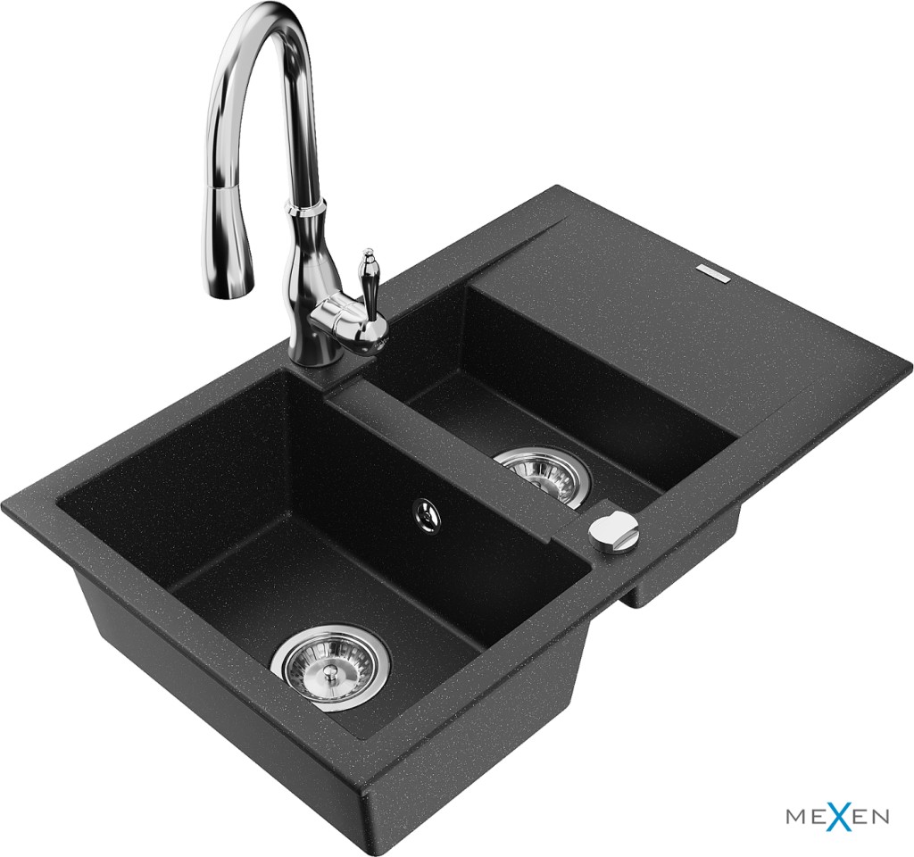 Technické dáta: drez: Rozmer: 737x475x177mm Hĺbka komory: 167 mm (väčšia), 107 mm (menšia) Rozmery komory: 395x272 mm (väčšie), (menšie) 375x182 mm Priemer odtoku: ø90 mm Typ: 1,5-komorový s krátkym odkvapkávačom Typ: Zapustené do pracovnej dosky Farba: čierna/strieborná metalíza Povrchová úprava sifónu: Chrome Materiál: žula (80% žulové kamenivo, 20% živice) Prepadový otvor: Áno Otvory: (batérie, automatické) 2 Inštalácia: Univerzálna, je možné inštalovať s odkvapkávačom na ľavú alebo pravú stranu Vysoká odolnosť proti poškriabaniu a zmene farby Odolnosť proti tepelným šokom Ľahko čistiteľný povrch kuchynská batéria: Materiál: mosadz Farba: Chrome Hlava: Keramická Prevzdušňovač: Áno Typ: Jedna páka Výška batérie: 410 mm Rozsah výtoku: 231 mm(GT) Ean: 5905315034304