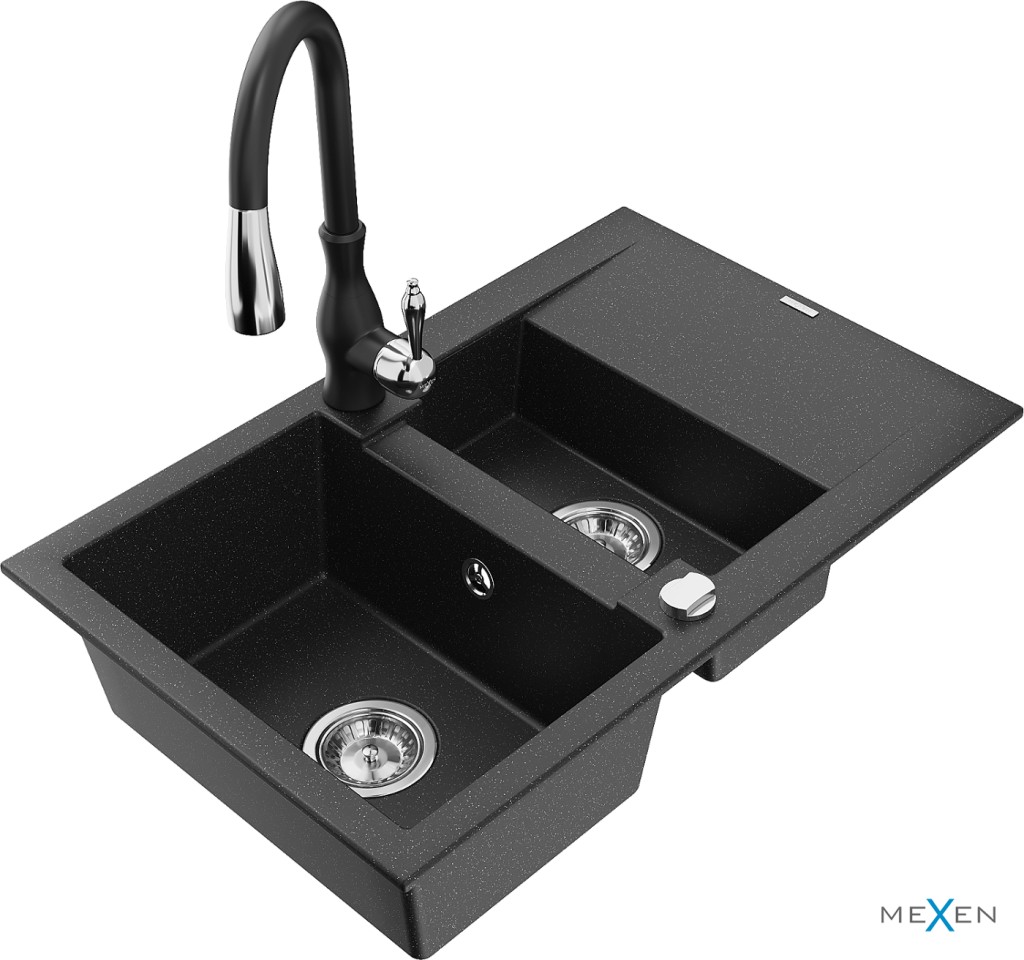 Technické dáta: drez: Rozmer: 737x475x177mm Hĺbka komory: 167 mm (väčšia), 107 mm (menšia) Rozmery komory: 395x272 mm (väčšie), (menšie) 375x182 mm Priemer odtoku: ø90 mm Typ: 1,5-komorový s krátkym odkvapkávačom Typ: Zapustené do pracovnej dosky Farba: čierna/strieborná metalíza Povrchová úprava sifónu: Chrome Materiál: žula (80% žulové kamenivo, 20% živice) Prepadový otvor: Áno Otvory: (batérie, automatické) 2 Inštalácia: Univerzálna, je možné inštalovať s odkvapkávačom na ľavú alebo pravú stranu Vysoká odolnosť proti poškriabaniu a zmene farby Odolnosť proti tepelným šokom Ľahko čistiteľný povrch kuchynská batéria: Materiál: mosadz Čierna farba Hlava: Keramická Prevzdušňovač: Áno Typ: Jedna páka Výška batérie: 410 mm Rozsah výtoku: 231 mm(GT) Ean: 5905315034328