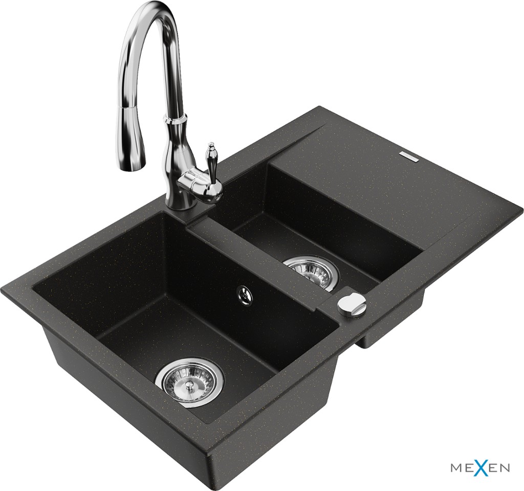 Technické dáta: drez: Rozmer: 737x475x177mm Hĺbka komory: 167 mm (väčšia), 107 mm (menšia) Rozmery komory: 395x272 mm (väčšie), (menšie) 375x182 mm Priemer odtoku: ø90 mm Typ: 1,5-komorový s krátkym odkvapkávačom Typ: Zapustené do pracovnej dosky Farba: čierna / zlatá metalíza Povrchová úprava sifónu: Chrome Materiál: žula (80% žulové kamenivo, 20% živice) Prepadový otvor: Áno Otvory: (batérie, automatické) 2 Inštalácia: Univerzálna, je možné inštalovať s odkvapkávačom na ľavú alebo pravú stranu Vysoká odolnosť proti poškriabaniu a zmene farby Odolnosť proti tepelným šokom Ľahko čistiteľný povrch kuchynská batéria: Materiál: mosadz Farba: Chrome Hlava: Keramická Prevzdušňovač: Áno Typ: Jedna páka Výška batérie: 410 mm Rozsah výtoku: 231 mm(GT) Ean: 5905315034342