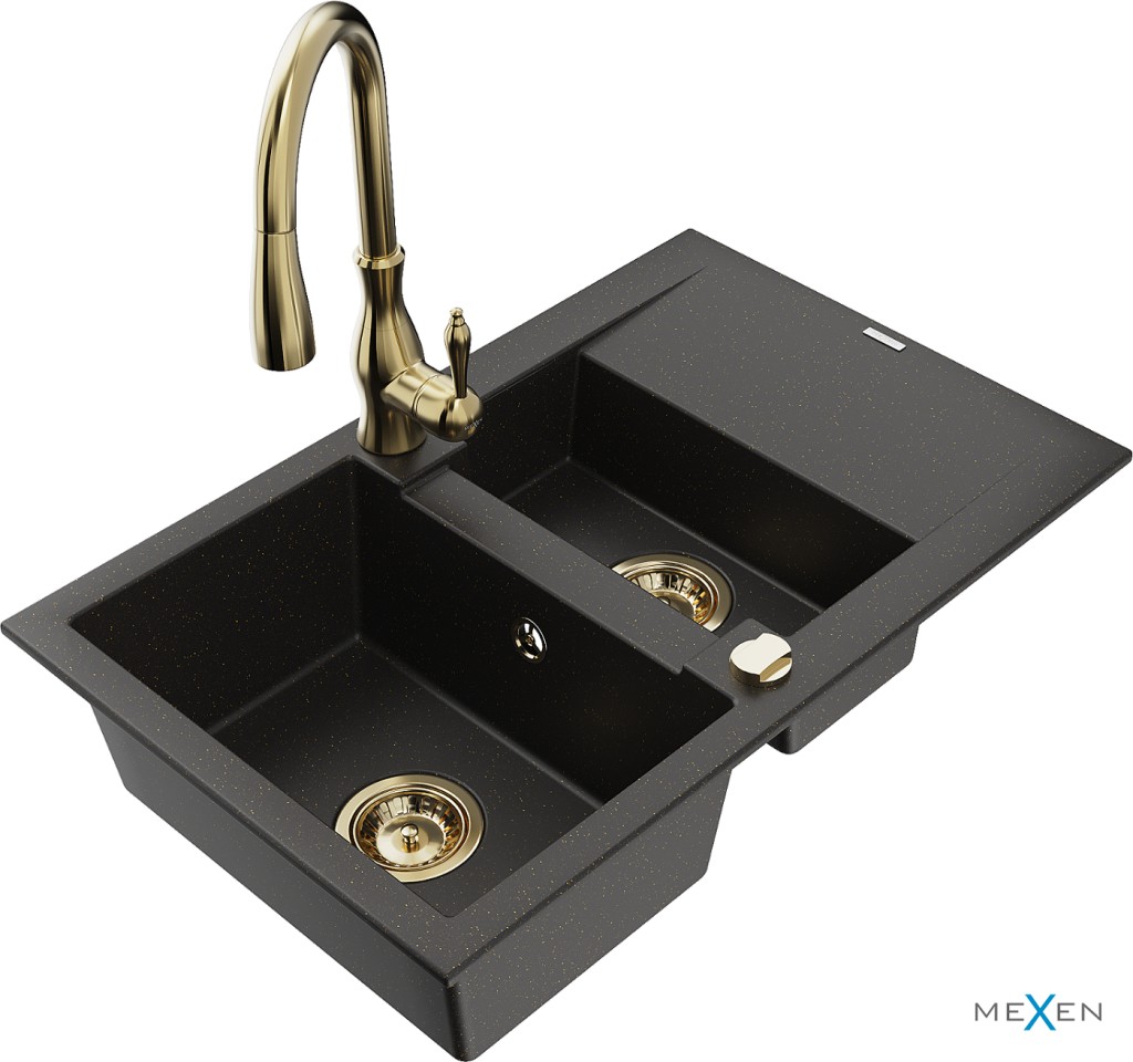 Technické dáta: drez: Rozmer: 737x475x177mm Hĺbka komory: 167 mm (väčšia), 107 mm (menšia) Rozmery komory: 395x272 mm (väčšie), (menšie) 375x182 mm Priemer odtoku: ø90 mm Typ: 1,5-komorový s krátkym odkvapkávačom Typ: Zapustené do pracovnej dosky Farba: čierna / zlatá metalíza Povrchová úprava sifónu: zlatá Materiál: žula (80% žulové kamenivo, 20% živice) Prepadový otvor: Áno Otvory: (batérie, automatické) 2 Inštalácia: Univerzálna, je možné inštalovať s odkvapkávačom na ľavú alebo pravú stranu Vysoká odolnosť proti poškriabaniu a zmene farby Odolnosť proti tepelným šokom Ľahko čistiteľný povrch kuchynská batéria: Materiál: mosadz Farba: Zlatá Hlava: Keramická Prevzdušňovač: Áno Typ: Jedna páka Výška batérie: 410 mm Rozsah výtoku: 231 mm(GT) Ean: 5905315034359