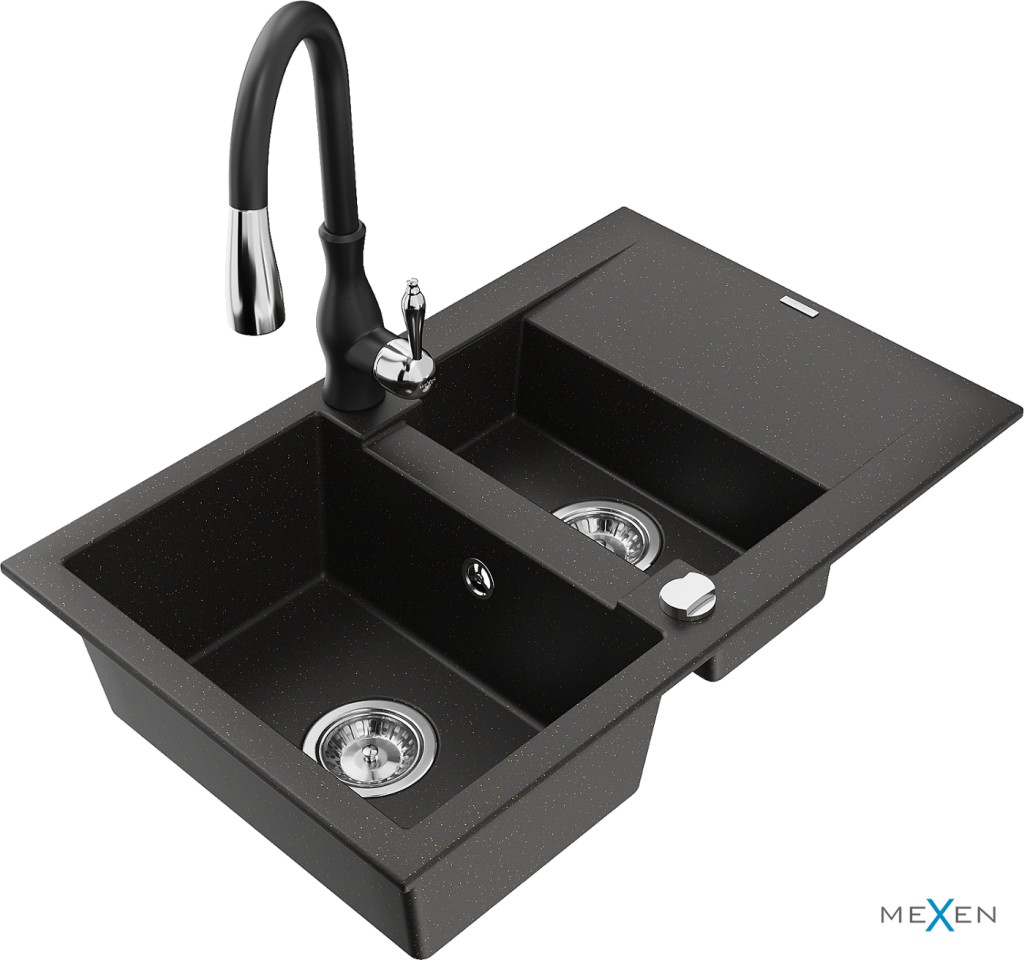 Technické dáta: drez: Rozmer: 737x475x177mm Hĺbka komory: 167 mm (väčšia), 107 mm (menšia) Rozmery komory: 395x272 mm (väčšie), (menšie) 375x182 mm Priemer odtoku: ø90 mm Typ: 1,5-komorový s krátkym odkvapkávačom Typ: Zapustené do pracovnej dosky Farba: čierna / zlatá metalíza Povrchová úprava sifónu: Chrome Materiál: žula (80% žulové kamenivo, 20% živice) Prepadový otvor: Áno Otvory: (batérie, automatické) 2 Inštalácia: Univerzálna, je možné inštalovať s odkvapkávačom na ľavú alebo pravú stranu Vysoká odolnosť proti poškriabaniu a zmene farby Odolnosť proti tepelným šokom Ľahko čistiteľný povrch kuchynská batéria: Materiál: mosadz Čierna farba Hlava: Keramická Prevzdušňovač: Áno Typ: Jedna páka Výška batérie: 410 mm Rozsah výtoku: 231 mm(GT) Ean: 5905315034373