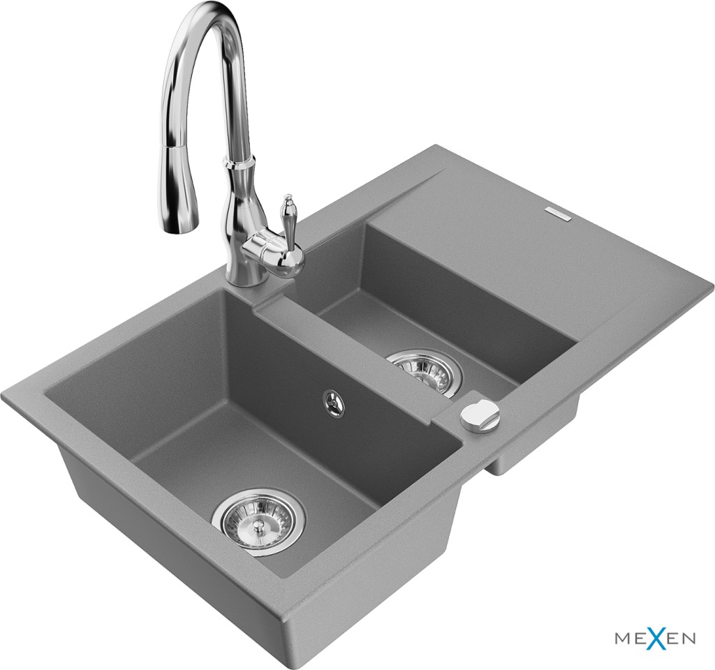 Technické dáta: Drez: Rozmer: 737x475x177 mm Hĺbka komory: 167 mm (väčšia), 107 mm (menšia) Rozmery komory: 395x272 mm (väčšie), (menšie) 375x182 mm Priemer odtoku: ø90 mm Typ: 1,5-miska s krátkym odkvapkávačom Typ: Zapustené do pracovnej dosky Šedá farba Povrchová úprava sifónu: Chrome Materiál: žula (80% žulové kamenivo 20% živice) Prepadový otvor: Áno Otvory: (batérie, automat) 2 Inštalácia: Univerzálna, je možné inštalovať s odkvapkávačom na ľavú alebo pravú stranu Vysoká odolnosť proti poškriabaniu a zmene farby Odolnosť proti tepelným šokom Povrch pre ľahké čistenie Kuchynská batéria: Materiál: mosadz Farba: Chrome Hlava: Keramická Perlátor: Áno Typ: Jednopákové Výška batérie: 410 mm Rozsah výtoku: 231 mm(GT) Ean: 5905315034250