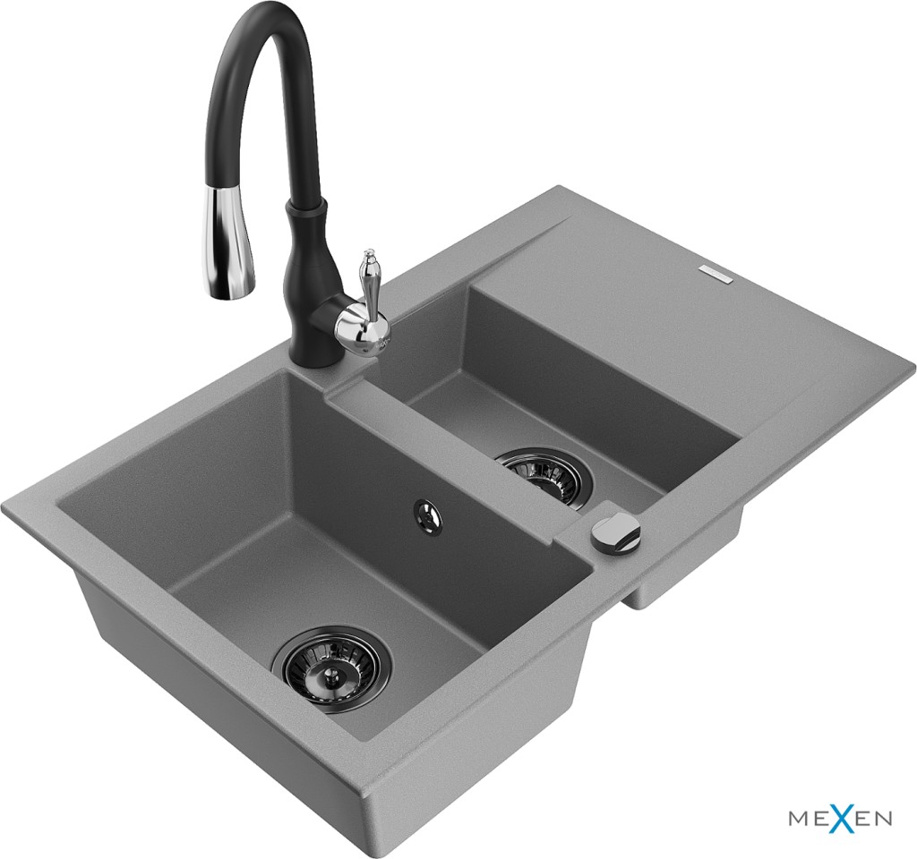 Technické dáta: Drez: Rozmer: 737x475x177 mm Hĺbka komory: 167 mm (väčšia), 107 mm (menšia) Rozmery komory: 395x272 mm (väčšie), (menšie) 375x182 mm Priemer odtoku: ø90 mm Typ: 1,5-miska s krátkym odkvapkávačom Typ: Zapustené do pracovnej dosky Šedá farba Povrchová úprava sifónu: čierna Materiál: žula (80% žulové kamenivo 20% živice) Prepadový otvor: Áno Otvory: (batérie, automat) 2 Inštalácia: Univerzálna, je možné inštalovať s odkvapkávačom na ľavú alebo pravú stranu Vysoká odolnosť proti poškriabaniu a zmene farby Odolnosť proti tepelným šokom Povrch pre ľahké čistenie Kuchynská batéria: Materiál: mosadz Čierna farba Hlava: Keramická Perlátor: Áno Typ: Jednopákové Výška batérie: 410 mm Rozsah výtoku: 231 mm(GT) Ean: 5905315034281