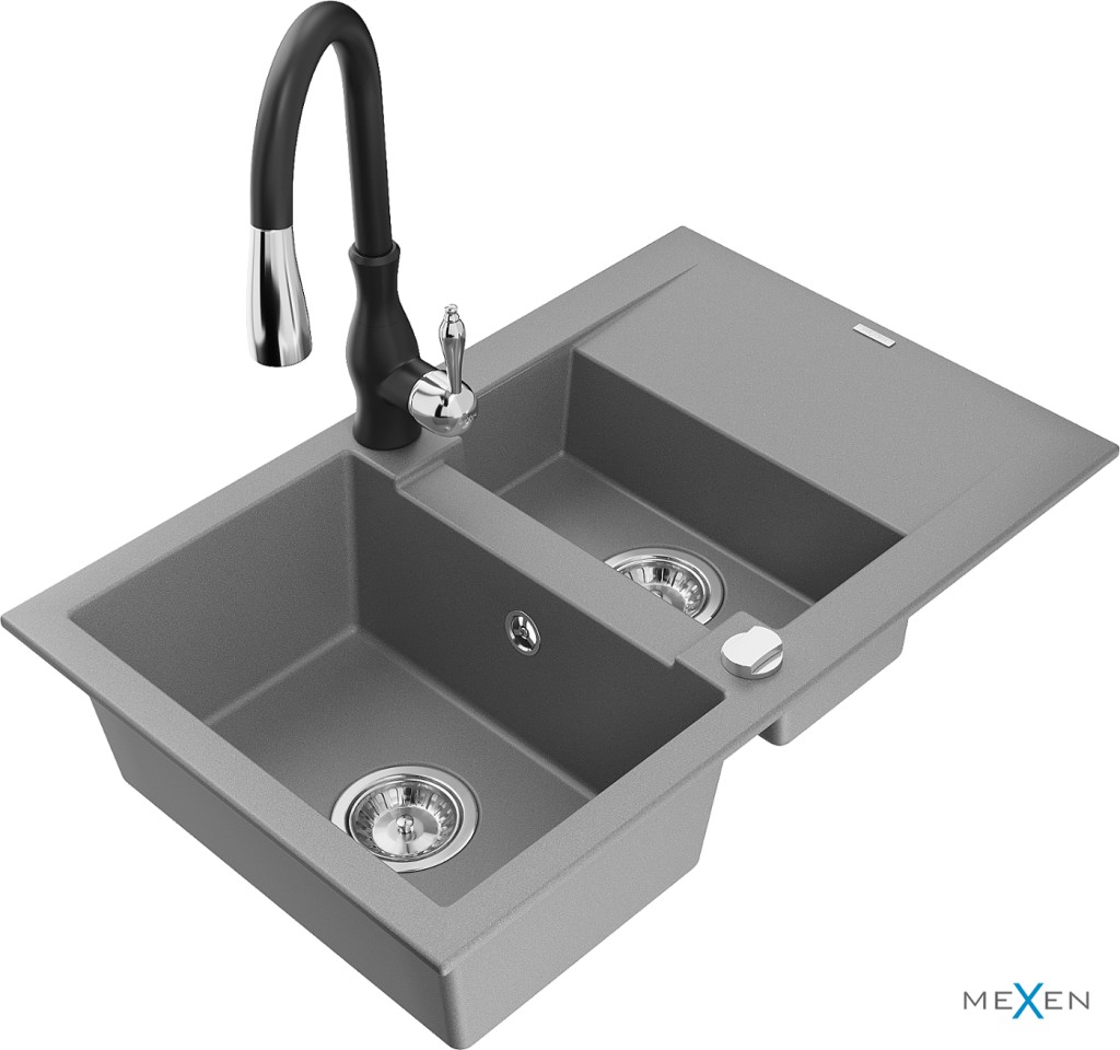 Technické dáta: Drez: Rozmer: 737x475x177 mm Hĺbka komory: 167 mm (väčšia), 107 mm (menšia) Rozmery komory: 395x272 mm (väčšie), (menšie) 375x182 mm Priemer odtoku: ø90 mm Typ: 1,5-miska s krátkym odkvapkávačom Typ: Zapustené do pracovnej dosky Šedá farba Povrchová úprava sifónu: Chrome Materiál: žula (80% žulové kamenivo 20% živice) Prepadový otvor: Áno Otvory: (batérie, automat) 2 Inštalácia: Univerzálna, je možné inštalovať s odkvapkávačom na ľavú alebo pravú stranu Vysoká odolnosť proti poškriabaniu a zmene farby Odolnosť proti tepelným šokom Povrch pre ľahké čistenie Kuchynská batéria: Materiál: mosadz Čierna farba Hlava: Keramická Perlátor: Áno Typ: Jednopákové Výška batérie: 410 mm Rozsah výtoku: 231 mm(GT) Ean: 5905315034274