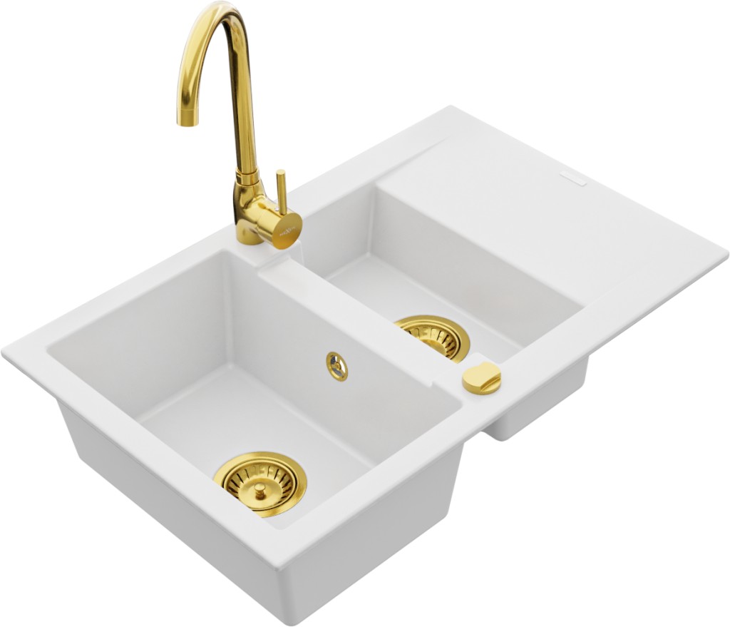 Technické dáta: drez: Rozmer: 737x475x177mm Hĺbka komory: 167 mm (väčšia), 107 mm (menšia) Rozmery komory: 395x272 mm (väčšie), (menšie) 375x182 mm Priemer odtoku: ø90 mm Typ: 1,5-komorový s krátkym odkvapkávačom Typ: Zapustené do pracovnej dosky biela farba Povrchová úprava sifónu: zlatá Materiál: žula (80% žulové kamenivo, 20% živice) Prepadový otvor: Áno Otvory: (batérie, automatické) 2 Inštalácia: Univerzálna, je možné inštalovať s odkvapkávačom na ľavú alebo pravú stranu Vysoká odolnosť proti poškriabaniu a zmene farby Odolnosť proti tepelným šokom Ľahko čistiteľný povrch kuchynská batéria: Materiál: mosadz Farba: Zlatá Hlava: Keramická Prevzdušňovač: Áno Výška batérie: 335 mm Rozsah výtoku: 180 mm(GT) Ean: 5907709189867