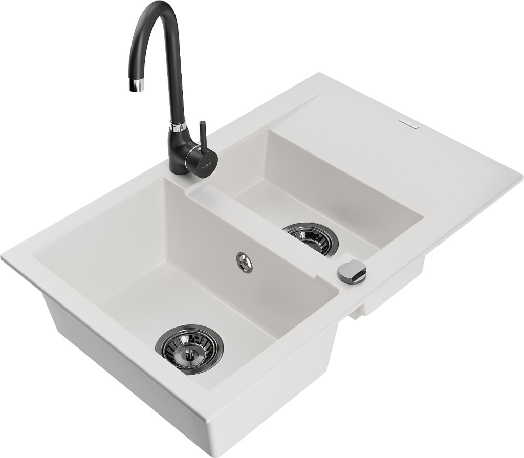 Technické dáta: drez: Rozmer: 737x475x177mm Hĺbka komory: 167 mm (väčšia), 107 mm (menšia) Rozmery komory: 395x272 mm (väčšie), (menšie) 375x182 mm Priemer odtoku: ø90 mm Typ: 1,5-komorový s krátkym odkvapkávačom Typ: Zapustené do pracovnej dosky biela farba Povrchová úprava sifónu: čierna Materiál: žula (80% žulové kamenivo, 20% živice) Prepadový otvor: Áno Otvory: (batérie, automatické) 2 Inštalácia: Univerzálna, je možné inštalovať s odkvapkávačom na ľavú alebo pravú stranu Vysoká odolnosť proti poškriabaniu a zmene farby Odolnosť proti tepelným šokom Ľahko čistiteľný povrch kuchynská batéria: Materiál: mosadz Čierna farba Hlava: Keramická Prevzdušňovač: Áno Typ: Jedna páka Výška batérie: 335 mm Rozsah výtoku: 180 mm(GT) Ean: 5905315014740