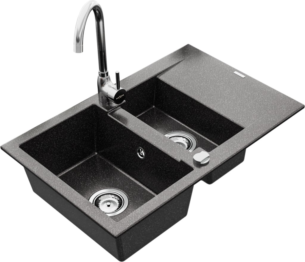 Špecifikácia produktu: drez: Rozmer: 737x475x177mm Hĺbka komory: 167 mm (väčšia), 107 mm (menšia) Rozmery komory: 395x272 mm (väčšie), (menšie) 375x182 mm Priemer odtoku: ø90 mm Typ: 1,5-miska s krátkym odkvapkávačom Typ: Zapustené do pracovnej dosky Farba: Škvrnitá čierna Materiál: žula (80% žulové kamenivo, 20% živice) Prepadový otvor: Áno Otvory: (batérie, automatické) 2 Inštalácia: Univerzálna, je možné inštalovať s odkvapkávačom na ľavú alebo pravú stranu Vysoká odolnosť proti poškriabaniu a zmene farby Odolnosť proti tepelným šokom Ľahko čistiteľný povrch kuchynská batéria: Materiál: mosadz Farba: Chrome Hlava: Keramická Prevzdušňovač: Áno Výška batérie: 335 mm Rozsah výtoku: 180 mm(GT) Ean: 5907709189942