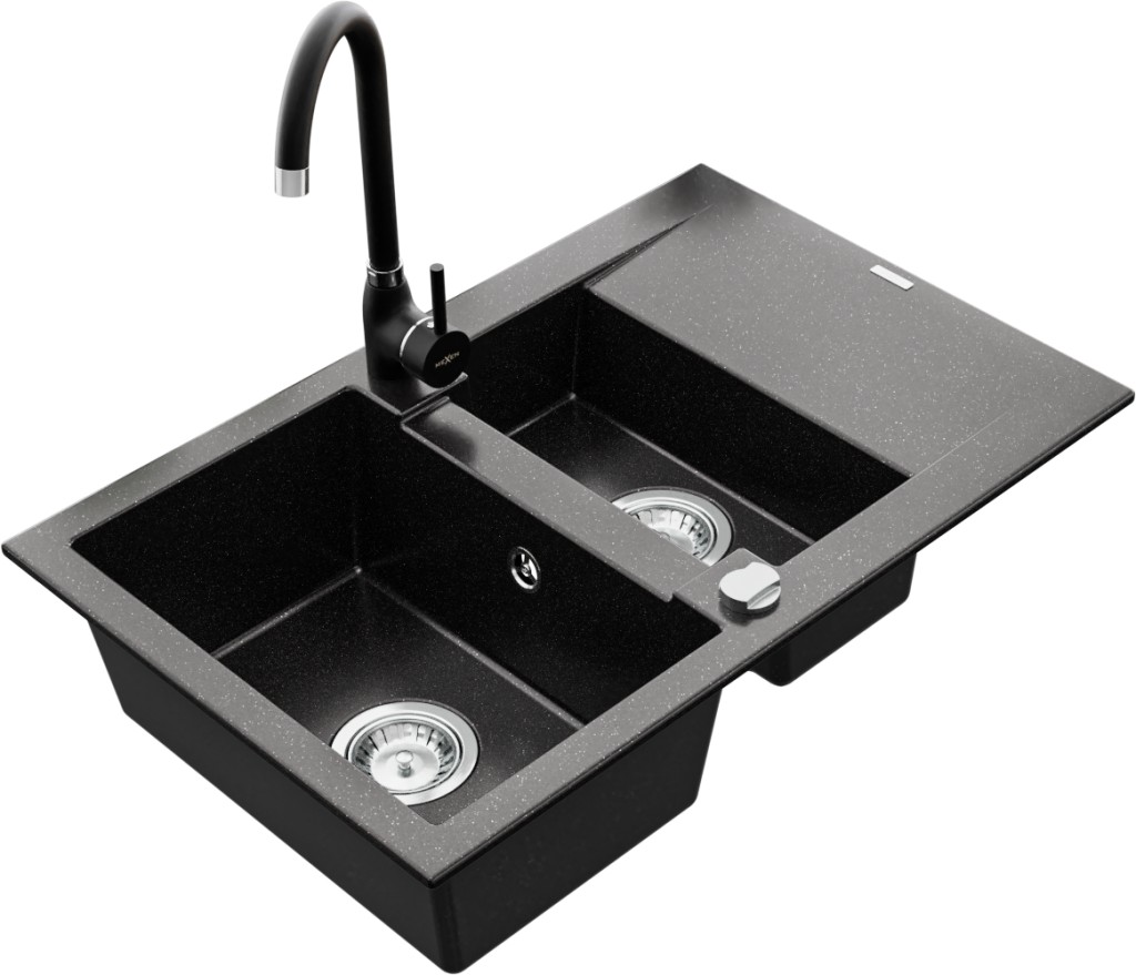 Technické dáta: drez: Rozmer: 737x475x177mm Hĺbka komory: 167 mm (väčšia), 107 mm (menšia) Rozmery komory: 395x272 mm (väčšie), (menšie) 375x182 mm Priemer odtoku: ø90 mm Typ: 1,5-komorový s krátkym odkvapkávačom Typ: Zapustené do pracovnej dosky Farba: čierna/strieborná metalíza Povrchová úprava sifónu: Chrome Materiál: žula (80% žulové kamenivo, 20% živice) Prepadový otvor: Áno Otvory: (batérie, automatické) 2 Inštalácia: Univerzálna, je možné inštalovať s odkvapkávačom na ľavú alebo pravú stranu Vysoká odolnosť proti poškriabaniu a zmene farby Odolnosť proti tepelným šokom Ľahko čistiteľný povrch kuchynská batéria: Materiál: mosadz Čierna farba Hlava: Keramická Prevzdušňovač: Áno Výška batérie: 335 mm Rozsah výtoku: 180 mm(GT) Ean: 5907709189911