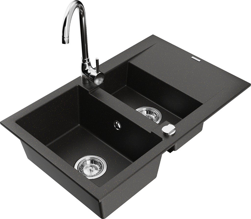 Technické dáta: drez: Rozmer: 737x475x177mm Hĺbka komory: 167 mm (väčšia), 107 mm (menšia) Rozmery komory: 395x272 mm (väčšie), (menšie) 375x182 mm Priemer odtoku: ø90 mm Typ: 1,5-komorový s krátkym odkvapkávačom Typ: Zapustené do pracovnej dosky Farba: čierna / zlatá metalíza Povrchová úprava sifónu: Chrome Materiál: žula (80% žulové kamenivo, 20% živice) Prepadový otvor: Áno Otvory: (batérie, automatické) 2 Inštalácia: Univerzálna, je možné inštalovať s odkvapkávačom na ľavú alebo pravú stranu Vysoká odolnosť proti poškriabaniu a zmene farby Odolnosť proti tepelným šokom Ľahko čistiteľný povrch kuchynská batéria: Materiál: mosadz Farba: Chrome Hlava: Keramická Prevzdušňovač: Áno Typ: Jedna páka Výška batérie: 335 mm Rozsah výtoku: 180 mm(GT) Ean: 5905315014832