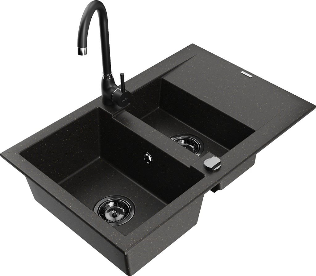 Technické dáta: drez: Rozmer: 737x475x177mm Hĺbka komory: 167 mm (väčšia), 107 mm (menšia) Rozmery komory: 395x272 mm (väčšie), (menšie) 375x182 mm Priemer odtoku: ø90 mm Typ: 1,5-komorový s krátkym odkvapkávačom Typ: Zapustené do pracovnej dosky Farba: čierna / zlatá metalíza Povrchová úprava sifónu: čierna Materiál: žula (80% žulové kamenivo, 20% živice) Prepadový otvor: Áno Otvory: (batérie, automatické) 2 Inštalácia: Univerzálna, je možné inštalovať s odkvapkávačom na ľavú alebo pravú stranu Vysoká odolnosť proti poškriabaniu a zmene farby Odolnosť proti tepelným šokom Ľahko čistiteľný povrch kuchynská batéria: Materiál: mosadz Čierna farba Hlava: Keramická Prevzdušňovač: Áno Typ: Jedna páka Výška batérie: 335 mm Rozsah výtoku: 180 mm(GT) Ean: 5905315014856