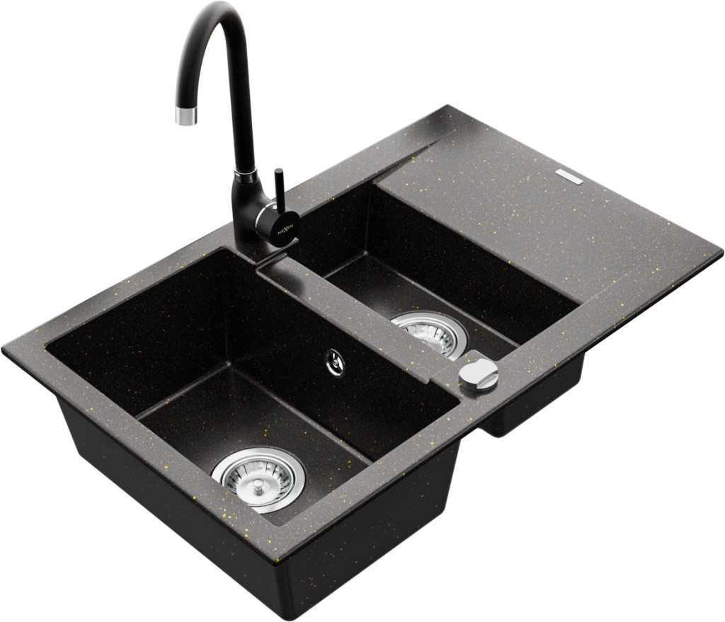 Technické dáta: drez: Rozmer: 737x475x177mm Hĺbka komory: 167 mm (väčšia), 107 mm (menšia) Rozmery komory: 395x272 mm (väčšie), (menšie) 375x182 mm Priemer odtoku: ø90 mm Typ: 1,5-komorový s krátkym odkvapkávačom Typ: Zapustené do pracovnej dosky Farba: čierna / zlatá metalíza Povrchová úprava sifónu: Chrome Materiál: žula (80% žulové kamenivo, 20% živice) Prepadový otvor: Áno Otvory: (batérie, automatické) 2 Inštalácia: Univerzálna, je možné inštalovať s odkvapkávačom na ľavú alebo pravú stranu Vysoká odolnosť proti poškriabaniu a zmene farby Odolnosť proti tepelným šokom Ľahko čistiteľný povrch kuchynská batéria: Materiál: mosadz Čierna farba Hlava: Keramická Prevzdušňovač: Áno Výška batérie: 335 mm Rozsah výtoku: 180 mm(GT) Ean: 5907709189935