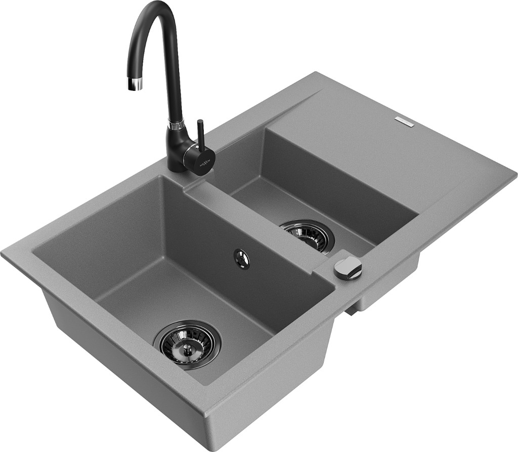 Technické dáta: Drez: Rozmer: 737x475x177 mm Hĺbka komory: 167 mm (väčšia), 107 mm (menšia) Rozmery komory: 395x272 mm (väčšie), (menšie) 375x182 mm Priemer odtoku: ø90 mm Typ: 1,5-miska s krátkym odkvapkávačom Typ: Zapustené do pracovnej dosky Šedá farba Povrchová úprava sifónu: čierna Materiál: žula (80% žulové kamenivo 20% živice) Prepadový otvor: Áno Otvory: (batérie, automat) 2 Inštalácia: Univerzálna, je možné inštalovať s odkvapkávačom na ľavú alebo pravú stranu Vysoká odolnosť proti poškriabaniu a zmene farby Odolnosť proti tepelným šokom Povrch pre ľahké čistenie Kuchynská batéria: Materiál: mosadz Čierna farba Hlava: Keramická Perlátor: Áno Typ: Jednopákové Výška batérie: 335 mm Rozsah výtoku: 180 mm(GT) Ean: 5905315014801
