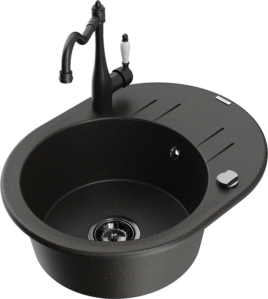 Technické dáta: drez: Rozmer: 586 x 458 x 190 mm Hĺbka komory: 180 mm Šírka komory: 378x374 mm Priemer odtoku: ø90 mm Typ: 1-miska s krátkym odkvapkávačom Typ: Zapustené do pracovnej dosky Farba: čierna / zlatá metalíza Povrchová úprava sifónu: čierna Materiál: žula (80% žulové kamenivo, 20% živice) Prepadový otvor: Áno Otvory: (batérie, automatické) 2 Inštalácia: Univerzálna, je možné inštalovať s odkvapkávačom na ľavú alebo pravú stranu Vysoká odolnosť proti poškriabaniu a zmene farby Odolnosť proti tepelným šokom Ľahko čistiteľný povrch Dva dodatočné vyfrézované otvory na samodierovanie ø35 kuchynská batéria: Materiál: mosadz Čierna farba Hlava: Keramická Prevzdušňovač: Áno Typ: Jedna páka Výška batérie: 290 mm Rozsah výtoku: 260 mm(GT) Ean: 5905315042088